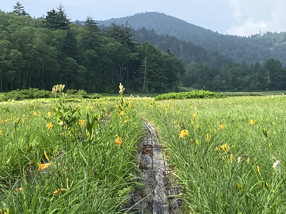 【小淵沢田代分岐に向かう木道のニッコウキスゲ】