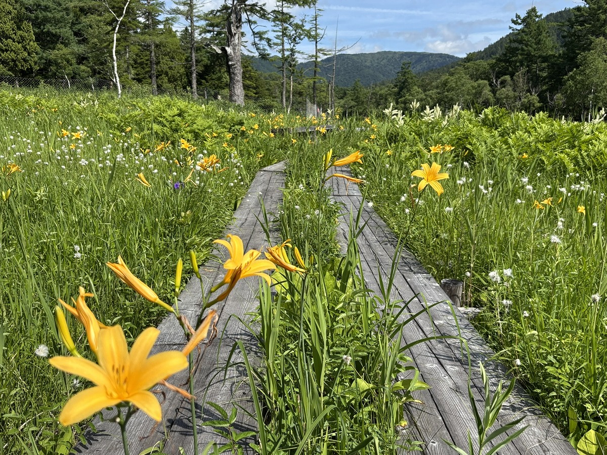 さらに奥へ進むと、ベンチがあります。周辺では、緑色の湿原の中に黄色のニッコウキスゲや白いワタスゲ、コバイケイソウ、さらに青紫色のヒオウギアヤメが点在し、とてもカラフルです。