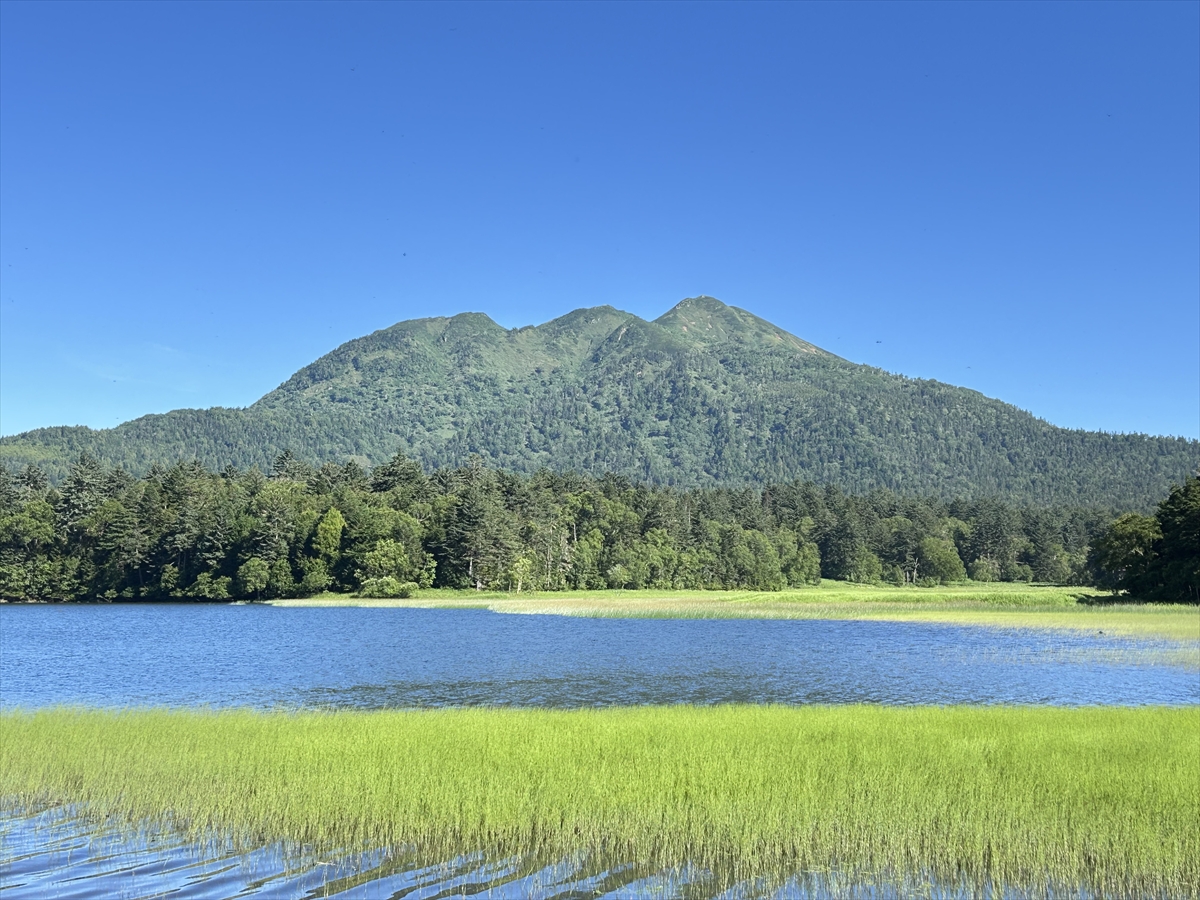 ここからは、湿原の奥にそびえる燧ヶ岳の雄大な山容を眺めることができます。