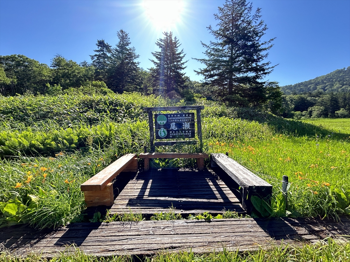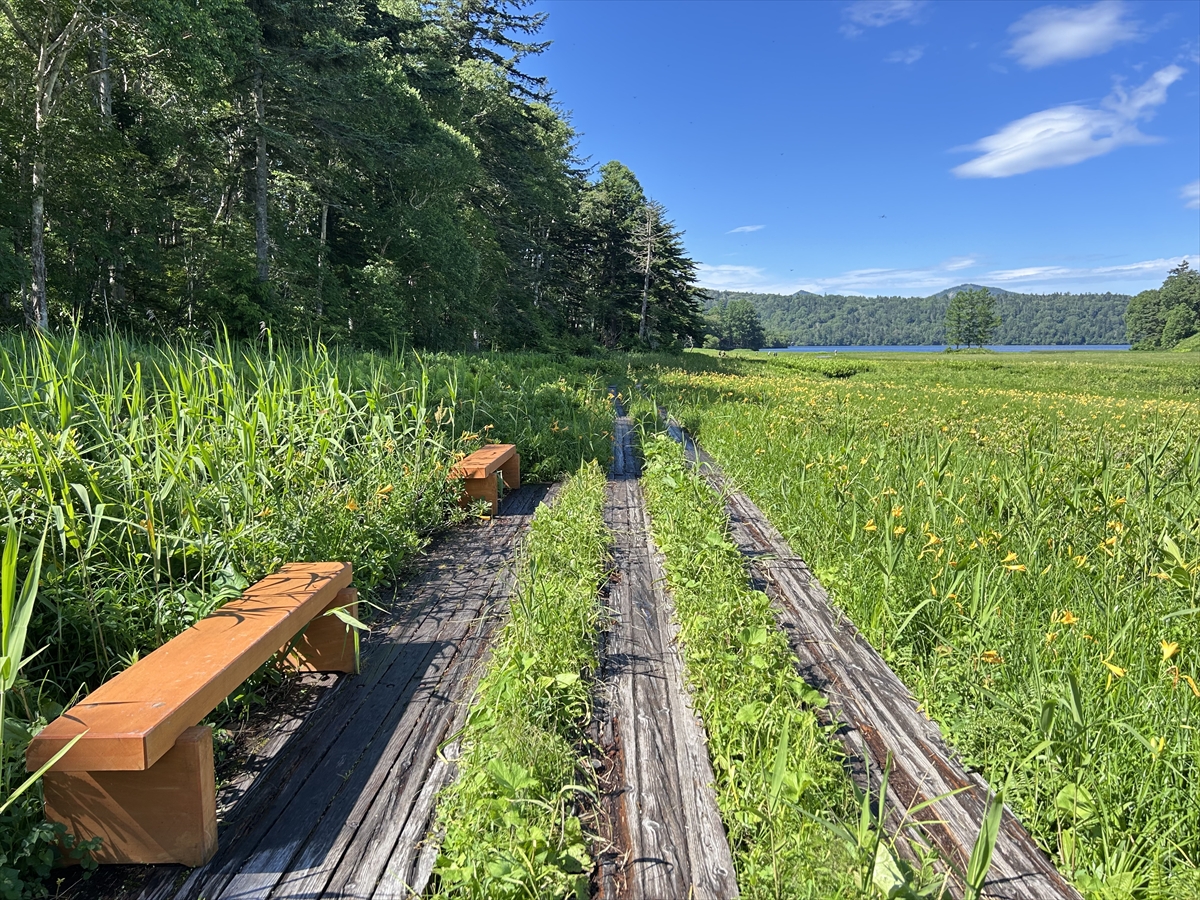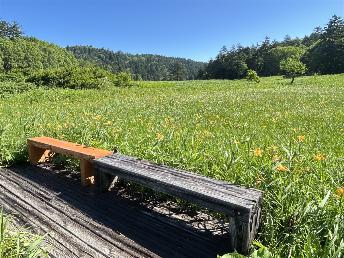 大江湿原には4箇所にベンチが設置されています。ベンチ周辺にもニッコウキスゲがたくさん咲いていますので、休憩にぜひご利用下さい。