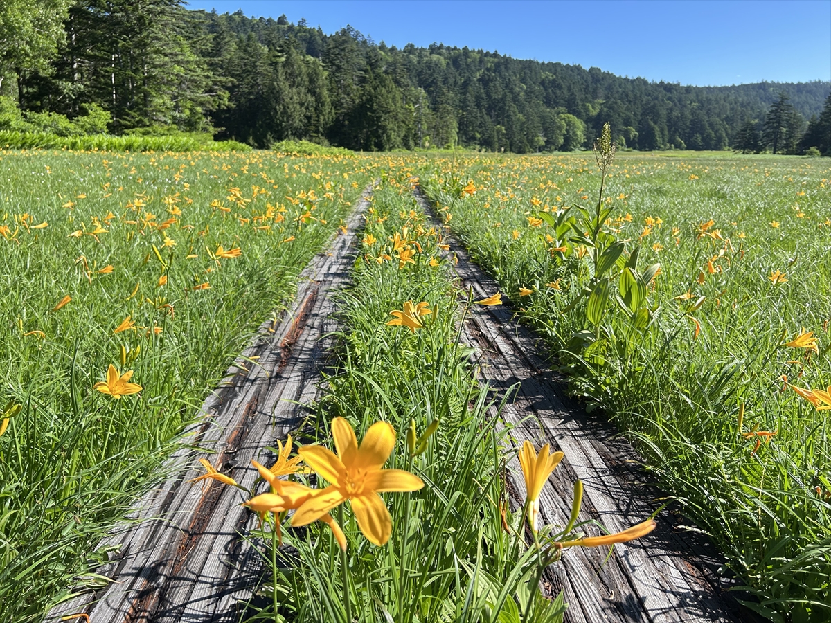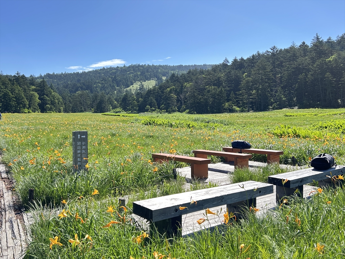 沼山峠から下ってくると、大江湿原最初のベンチです。ベンチ周辺にはニッコウキスゲが密集し、休憩される方たちとニッコウキスゲを撮影される方たちで賑わっていました。
