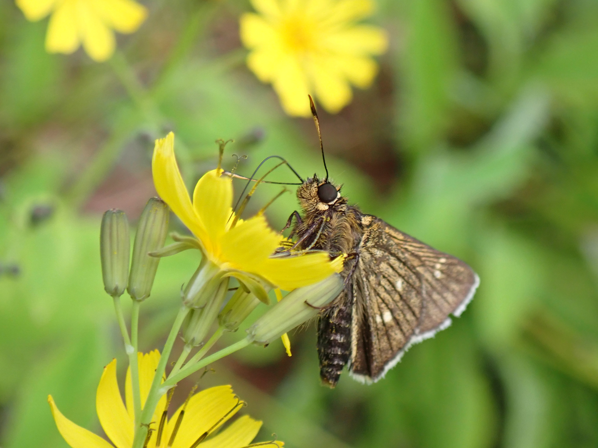 こちらのセセリチョウも長い口吻を巧みに動かし、ハナニガナの花から蜜を吸っています。また、花もたくさんの虫に集まってもらうことにより、受粉の助けを担ってもらっています。
