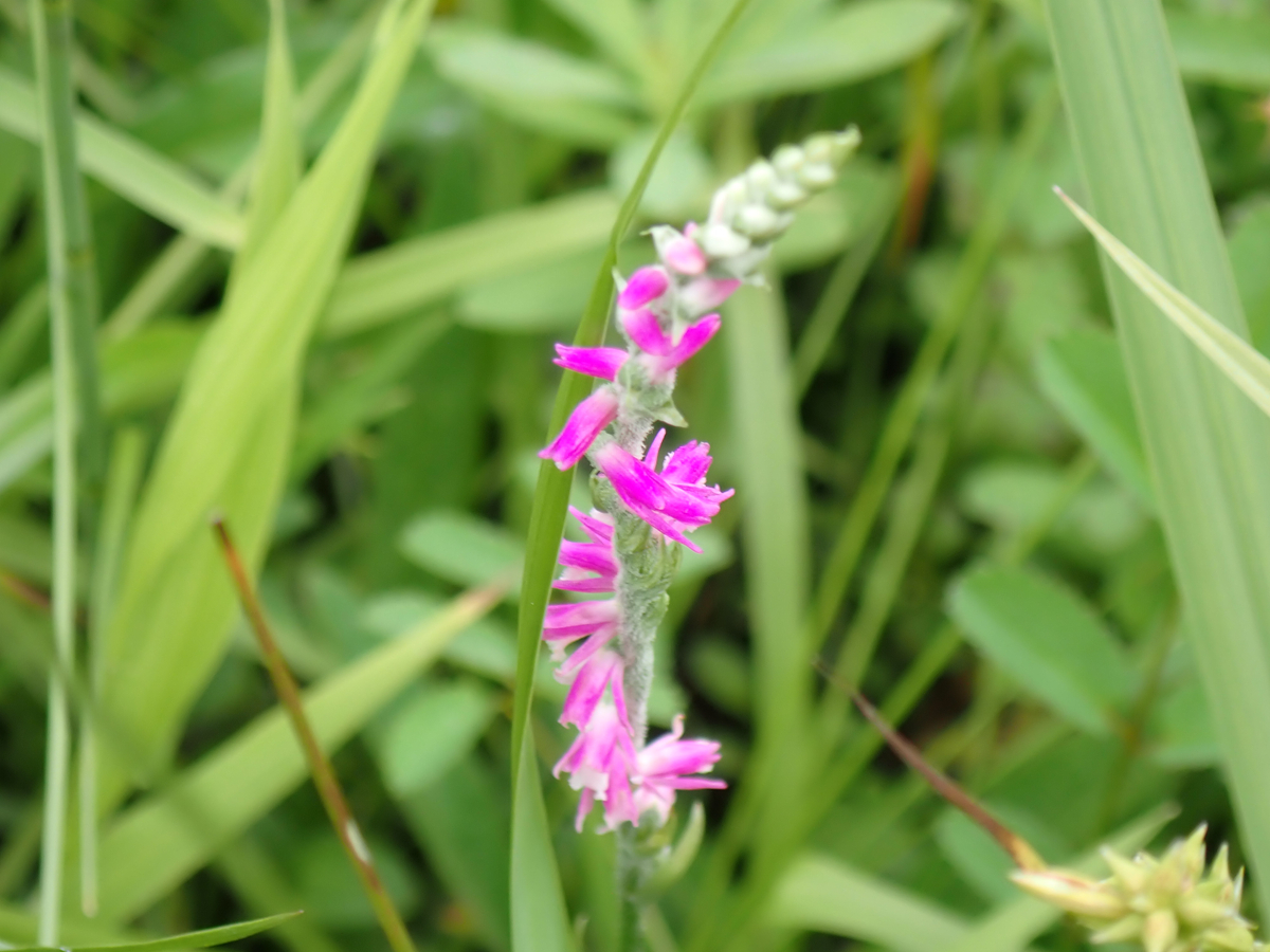 ニッコウキスゲの根元では、背の低い小さな花も咲き始めています。このネジバナも小さく目立たない花ですが、小さな可愛いピンクの花弁をつけています。花をよく観察すると、ラン科であることがわかります。