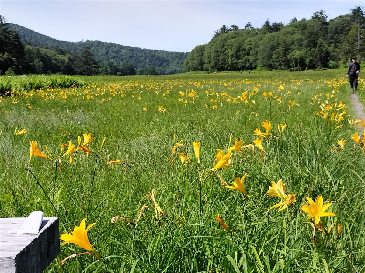 ニッコウキスゲに囲まれながら、ベンチで休憩もいいですね。