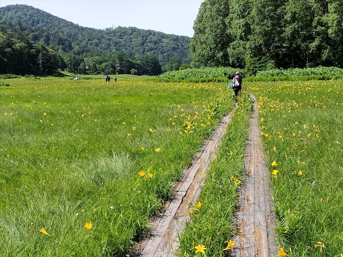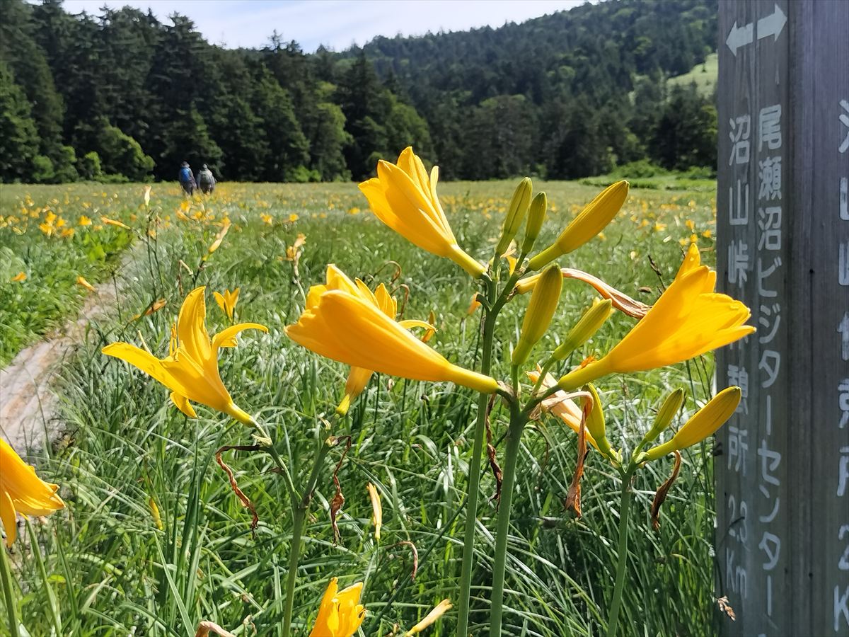 以前は尾瀬看板や三本カラマツ付近にたくさんニッコウキスゲが咲いていましたが、最近はこちらの大江湿原の北側にある小淵沢田代分岐あたりのほうがたくさんのニッコウキスゲが咲いています。