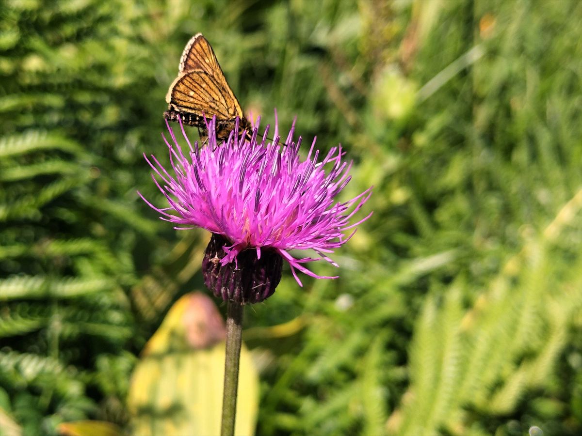 長く伸びた花茎の先につける鮮やかな赤紫色の花は、とてもよく目立ちます。昆虫たちにいつも人気のお花です。