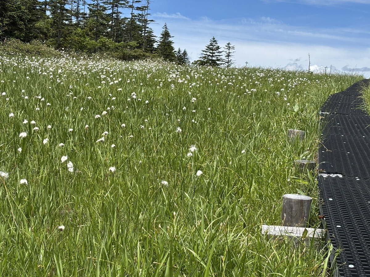 アヤメ平を過ぎて富士見峠に下る途中、富士見田代や富士見峠近くの湿原では、白いワタスゲが群生しています。なお、富士見峠公衆トイレは現在使用できませんのでご注意ください。