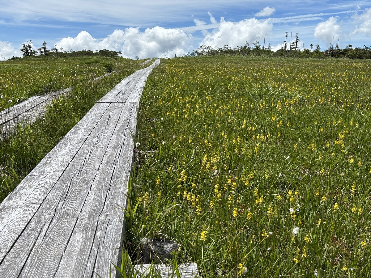 さらに登っていくと、やがてアヤメ平に到着します。アヤメ平は標高2000mほどにある湿原で、キンコウカが一面に咲いていました。