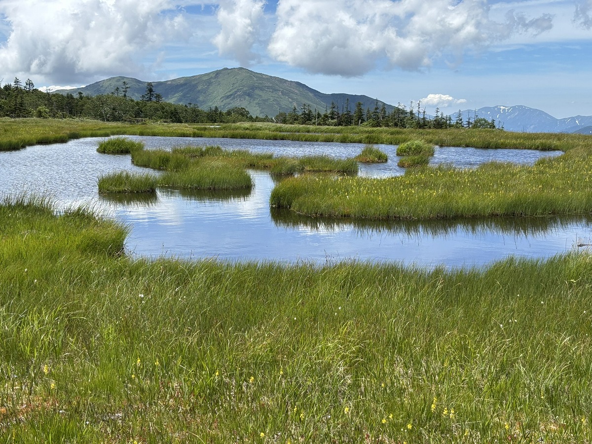 アヤメ平には大きな池塘が点在し、池塘越しに至仏山や燧ケ岳、上越の山々、会津駒ケ岳などを望むことができます。この日は、青い空に白い雲、そして緑色の湿原にキンコウカが咲き、まさに「天上の楽園」の名にふさわしい風景が見られました。