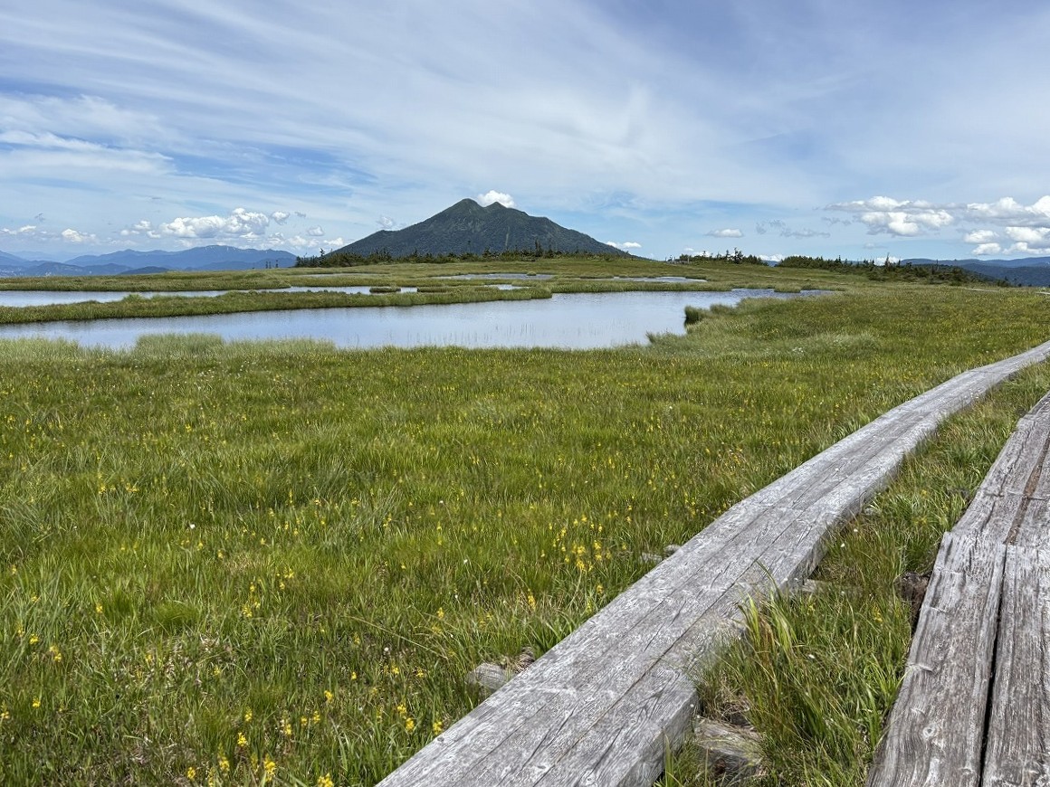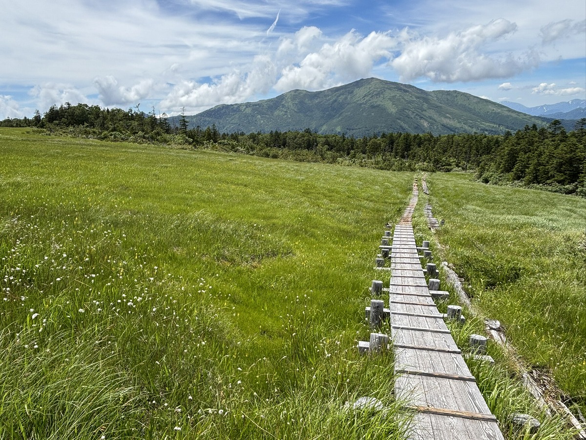 横田代ではキンコウカやワタスゲが広がっていました。傾斜のある広々とした湿原を登るにつれ、至仏山や遠くの山々が望めるようになります。横田代周辺では、傷んだ木道に注意してご通行ください。