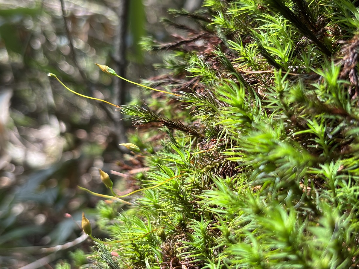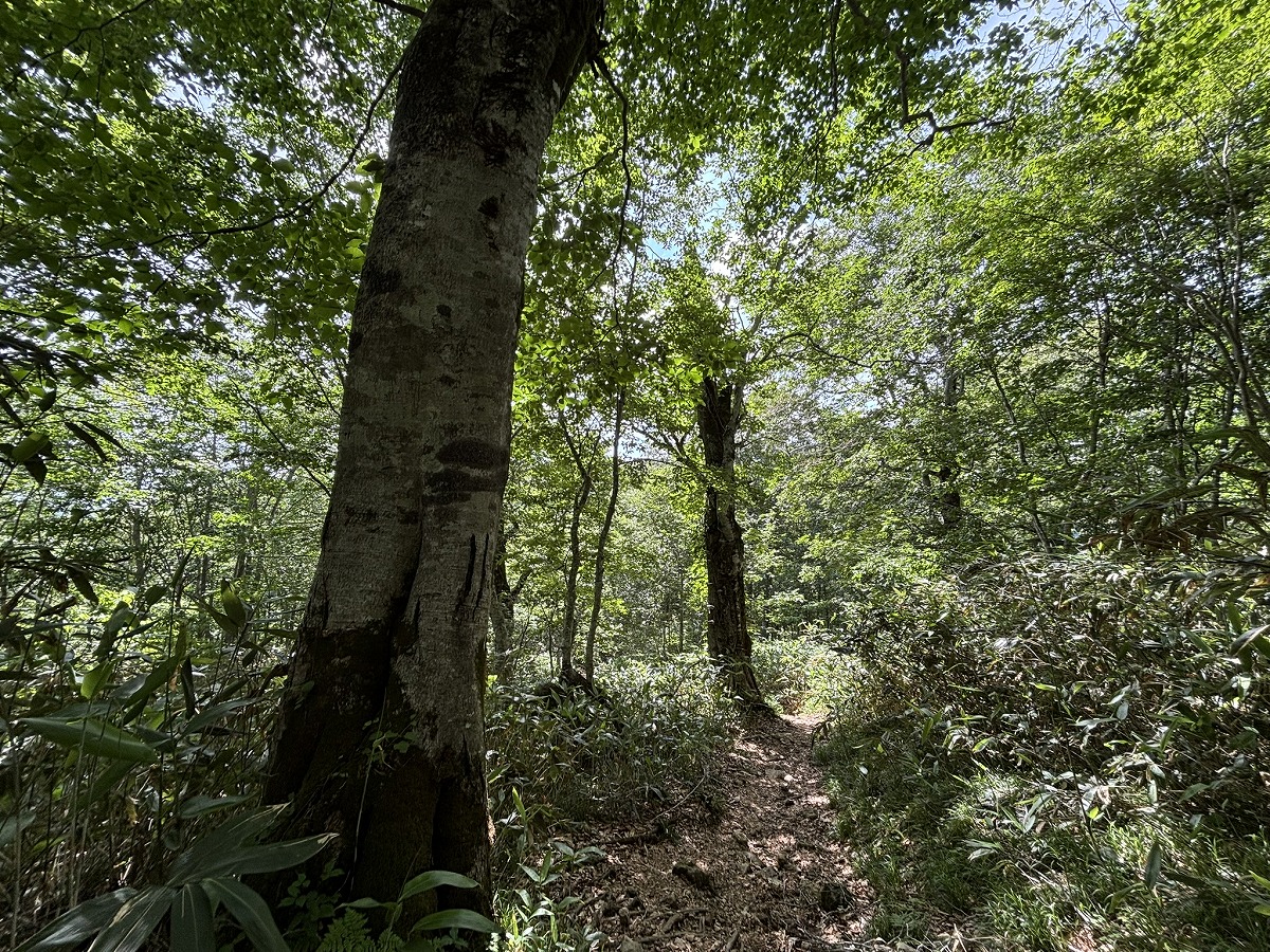 鳩待峠から登っていくと、始めは広葉樹の明るい森が広がっていますが、標高が上がるにつれて針葉樹が増えてきます。お花の少ない樹林帯区間ですが、足元の色鮮やかなコケや鳥の声、針葉樹のさわやかな香りを感じながらゆっくり登ってください。