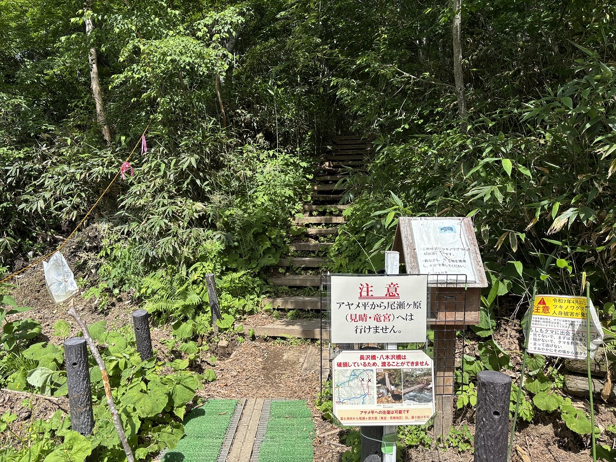 現在、橋の破損により長沢新道と八木沢道が通行不可となっており、アヤメ平から尾瀬ヶ原へ下ることはできませんのでご注意ください。
