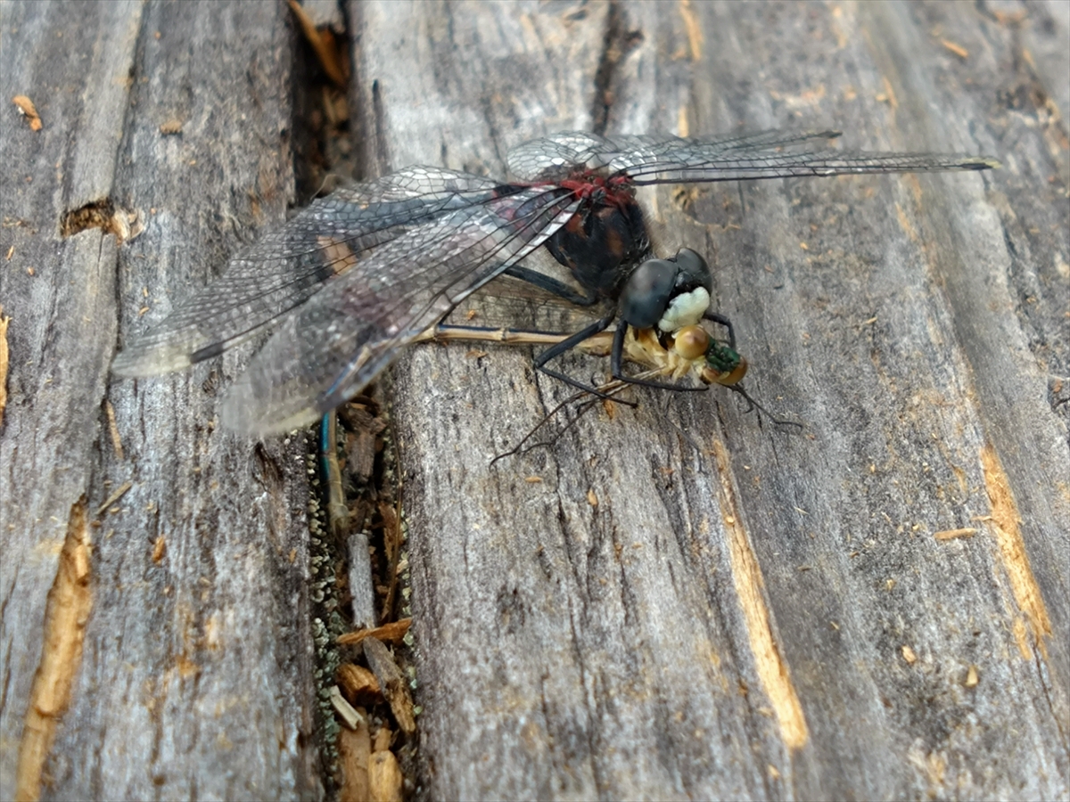 イトトンボを捕まえ食べようとしているカオジロトンボです。その足でしっかりと押さえつけ逃がしません。トンボは基本的に肉食であり、様々な昆虫をその足でカゴのように組んで抱え込みます。