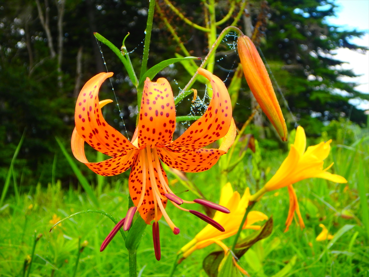 こちらはコオニユリとニッコウキスゲの競演です。どちらも大変色鮮やかであり、花弁も大きいためとても目立ちます。朝露に濡れた姿は、しっとりとしてとても美しいです。