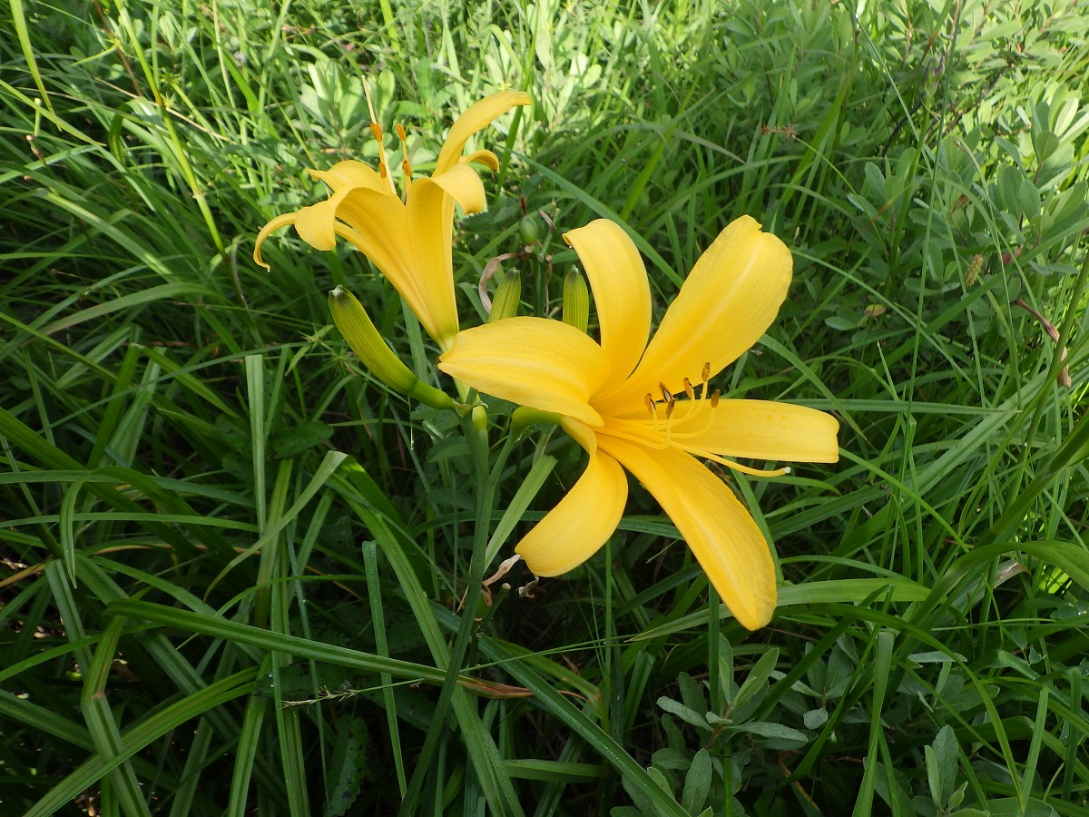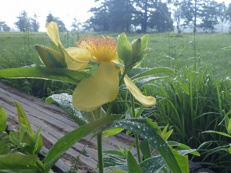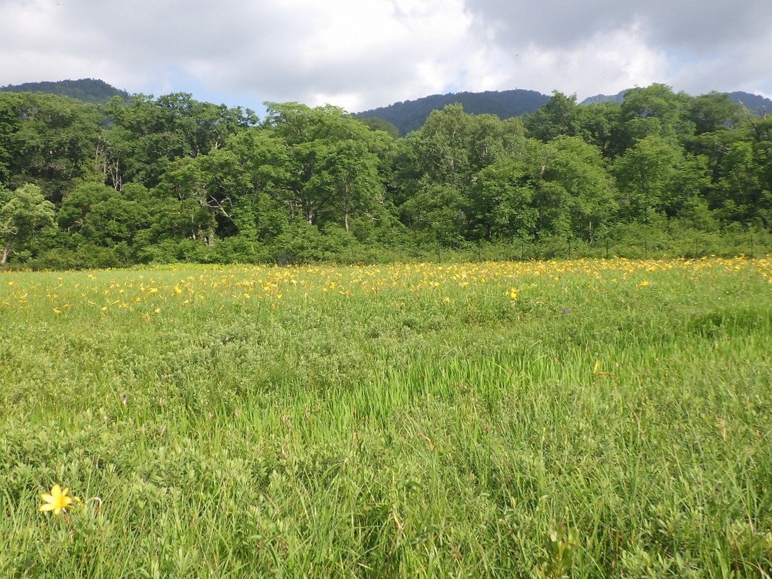 牛首分岐~ヨッピ吊橋間に、ニッコウキスゲが群生しています。湿原が黄色に染まり、緑と黄色の絨毯のようになっていました。