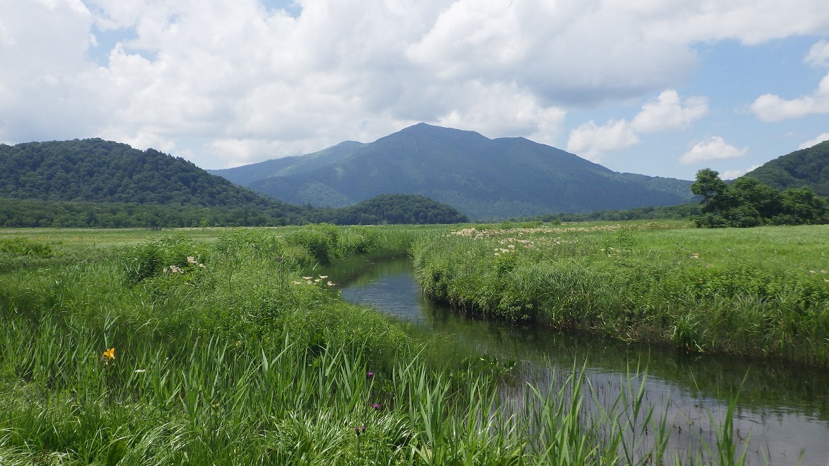 正面に見える山は至仏山です。青々とした湿原が夏らしいです。春はこの場所にミズバショウが群生し、ポスターなどに使われるほど、とても美しい風景が見られます。