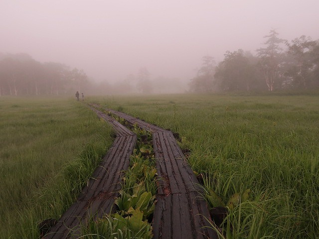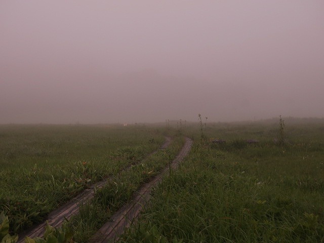 濃い霧の朝を迎えた尾瀬ヶ原です。燧ヶ岳も至仏山もうっすらと見えました。