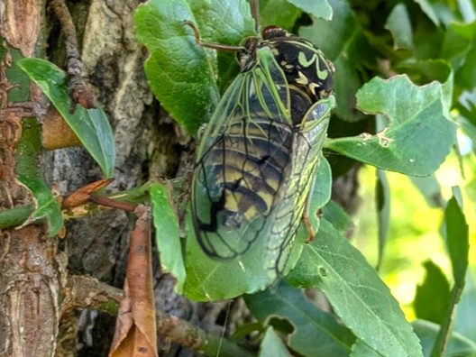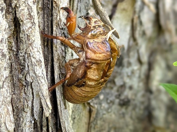 まだ成虫になったばかりのコエゾゼミを見ることができました。成虫の下の方をみると、幼虫の抜け殻がありました。長い間、地中でこの夏を待ち続け、ようやく地上に出てきました。尾瀬のこの夏を謳歌してもらいたいですね。