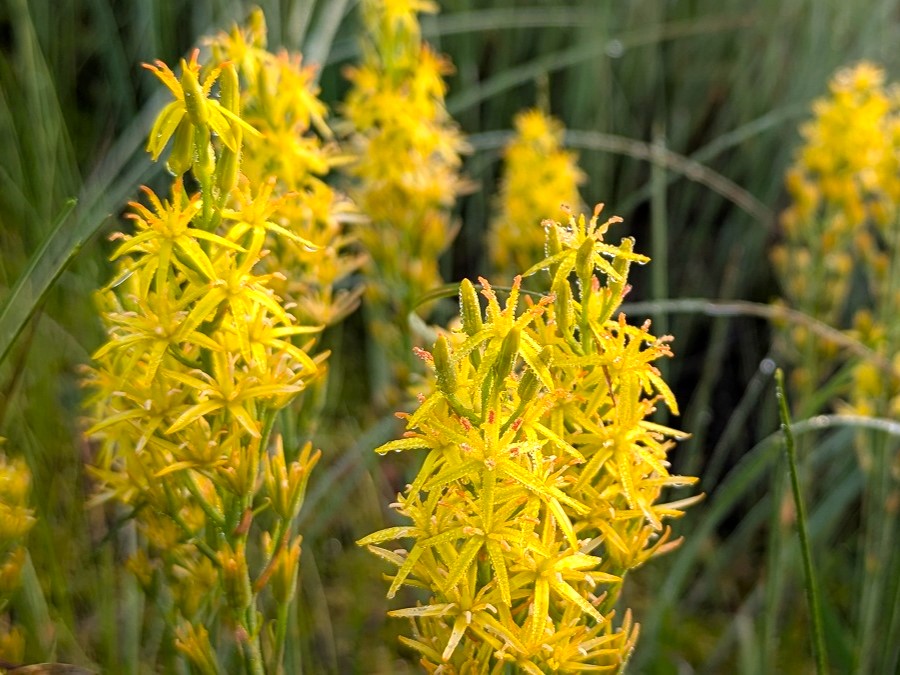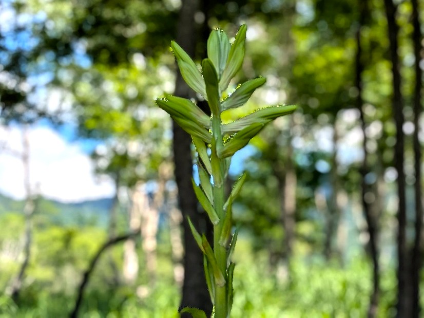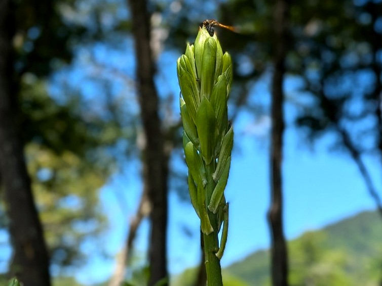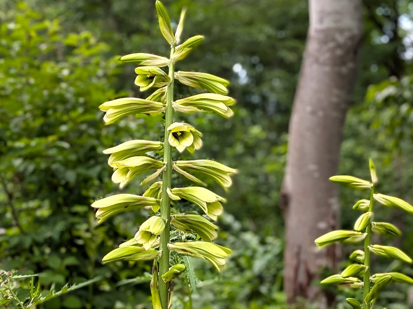 芽吹きの時から次第に存在感が増してくるのがオオウバユリです。地面から真っすぐ垂直に伸びてくる蕾が次第に分解し、縦につながる花になっていきます。ちょうど今、その変化の段階が山ノ鼻のあちらこちらで観察できます。