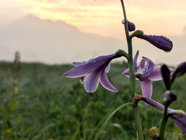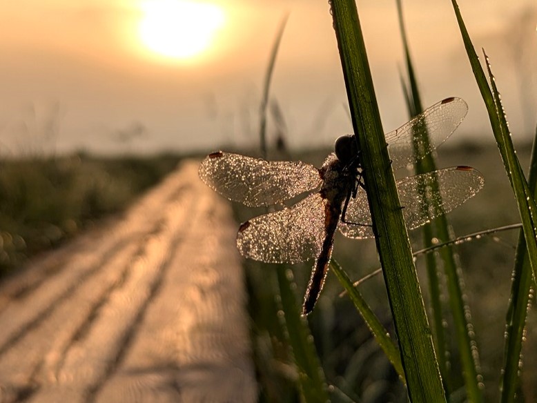 朝露をまとった花たちも夜明けを喜んでいるかのようでした。トンボも朝露を乾かし目覚めようとしていました。