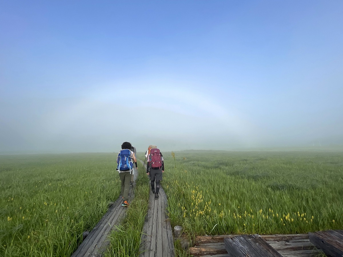 早朝から至仏山登山に出発する皆さん。「白虹を見るの初めて!」と目を輝かせながら、登山口に向かわれました。キンコウカの花が登山者の皆さんを見送っていました。朝、靄が出た日は、その後は快晴になります。きっと山頂から360度のすばらしい景色を望まれたことでしょう。