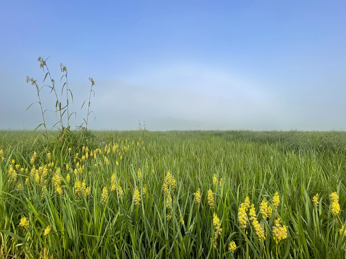 今朝、研究見本園で白い虹を見ることができました。ここでも、左の入口から入ったベンチ付近や木道脇で、キンコウカが群生しています。早朝に靄が発生して朝日が当たるとき、山ノ鼻では至仏山方向を見ると山を大きく囲む白い虹に出会えることがあります。カメラやスマホの広角レンズ越しに見ると、さらに良く見えます。
