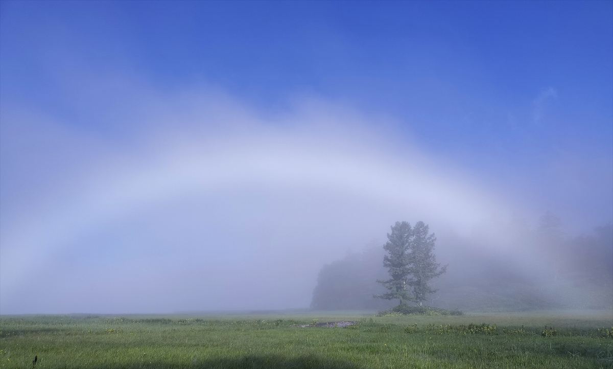 今朝の尾瀬沼はとても深い霧に包まれて、もしかすると白虹が出るかもしれないと、朝食もそこそこにして大江湿原に行ってみると、すでに多くのひとが木道に並んで写真撮影していました。尾瀬沼で白虹が出るのはとても珍しく、特別な朝となりました。