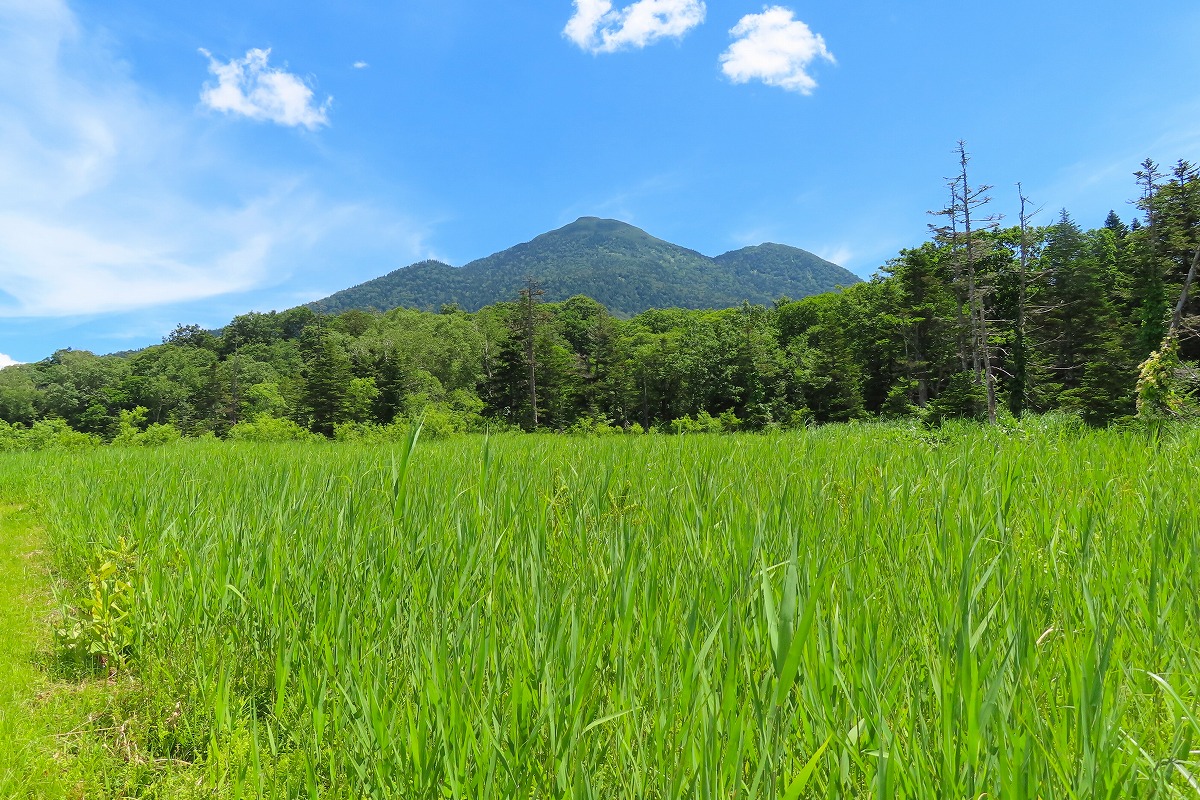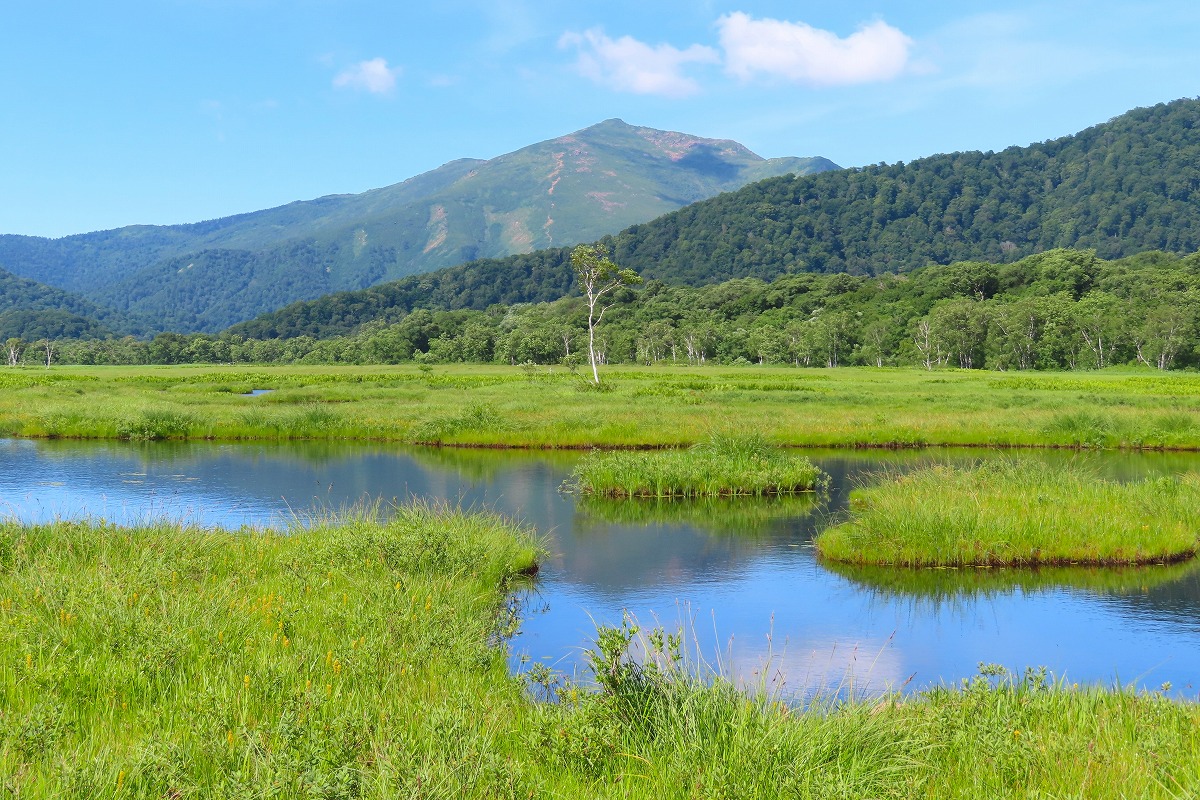 尾瀬ヶ原の景観を彩る至仏山と燧ヶ岳の両百名山、夏空の下くっきりとした姿でたたずみ、尾瀬ヶ原を見守っているようでした。