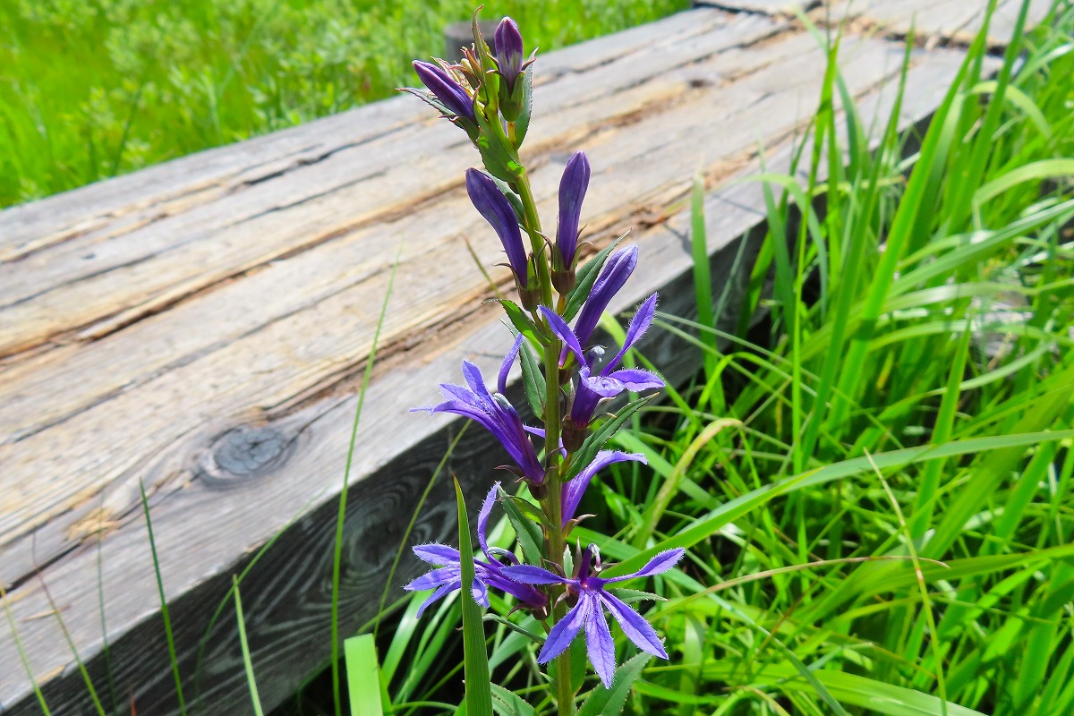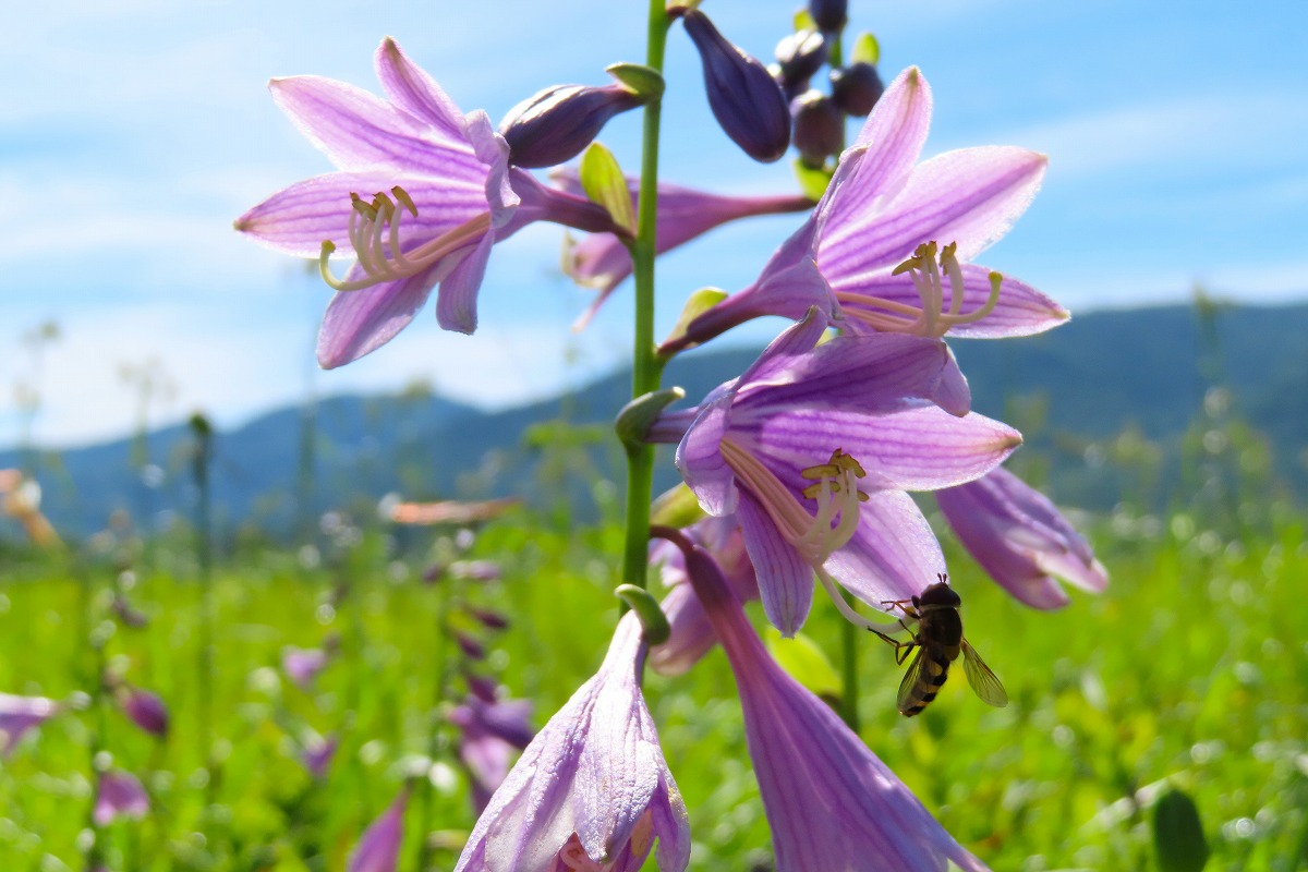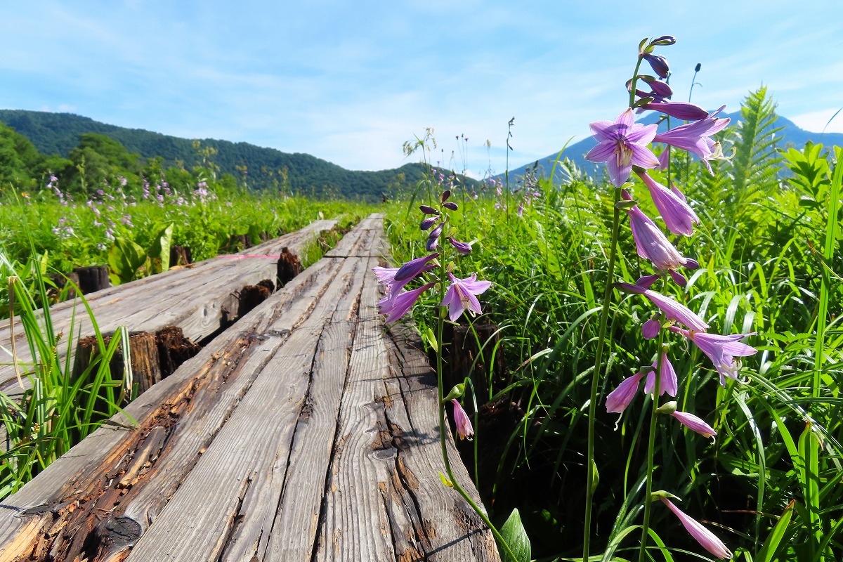 牛首からヨッピ吊橋の間では、ニッコウキスゲに変わりコバギボウシの群生が広がっていました。青空の下、淡紫色の花が咲き誇りとても清々しい光景でした。