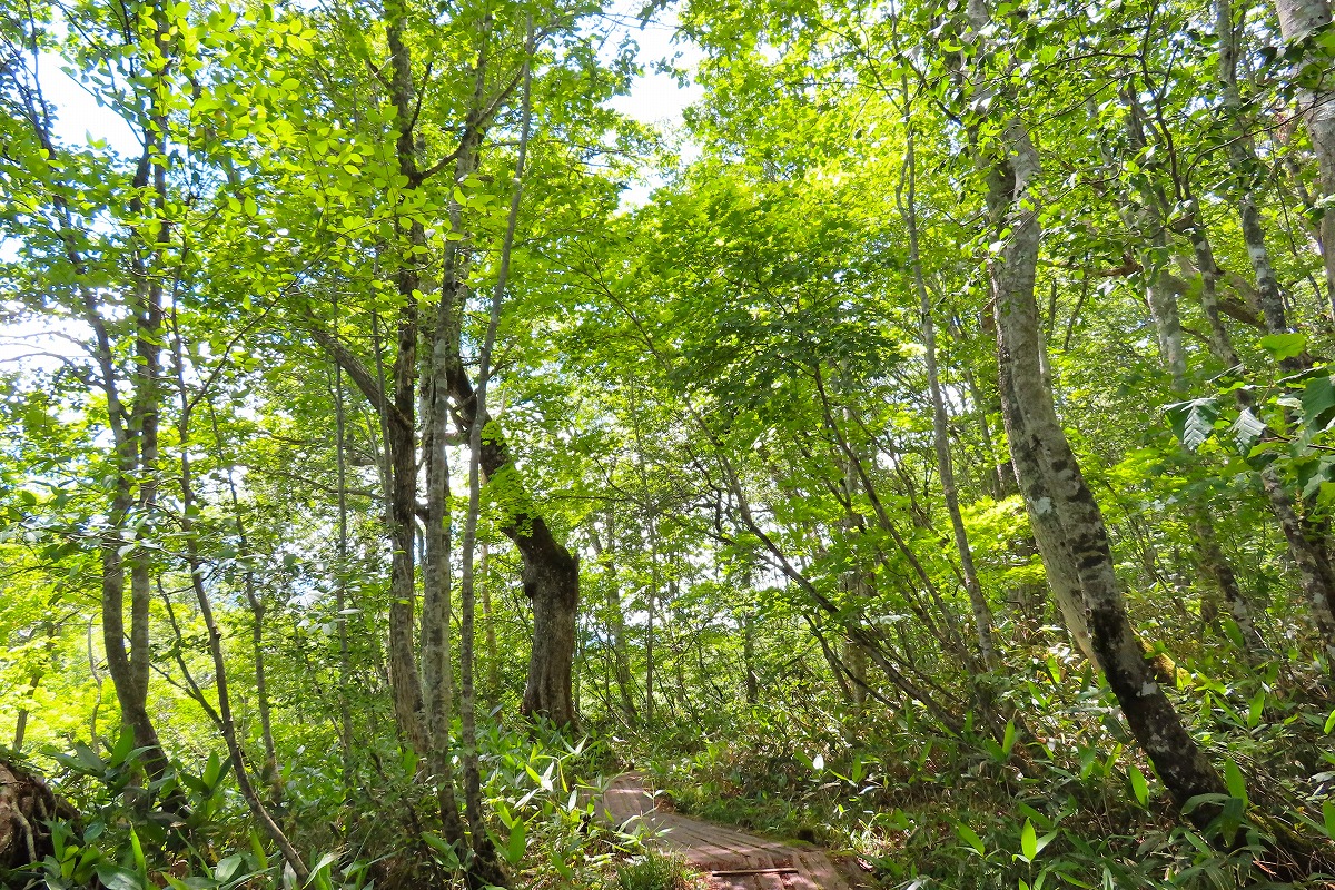 日差しを遮るものがほとんどない尾瀬ヶ原ですが、東電小屋から東電尾瀬橋にかけては大きな木々の林が広がっています。木漏れ日もとても綺麗で、暑い日には一息つける場所です。