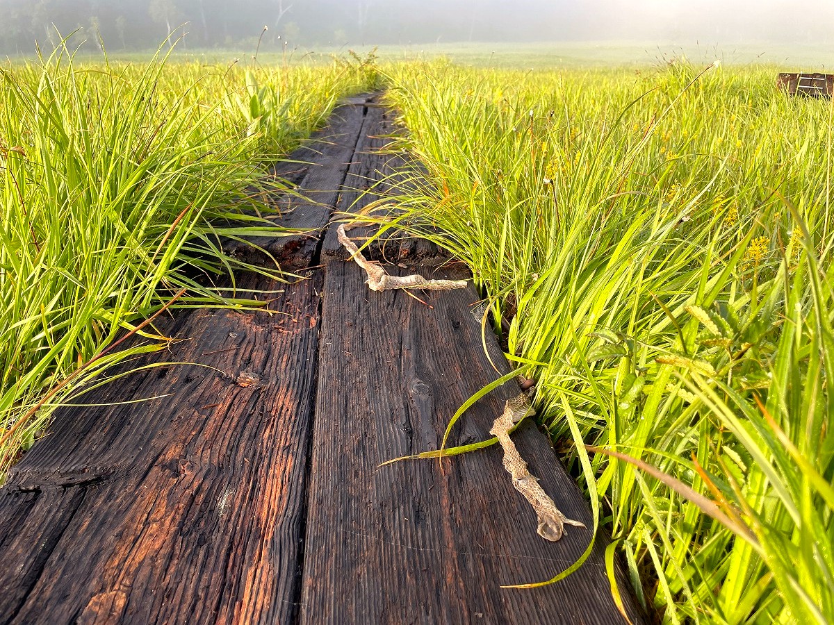 本物のヘビかと思い一瞬驚きましたが、ヘビの抜け殻でした。人の気配が少ない時間帯に、木道の上で脱皮をしたのでしょうか。自然の中で暮らしている生き物たちも木道を利用しているようです。