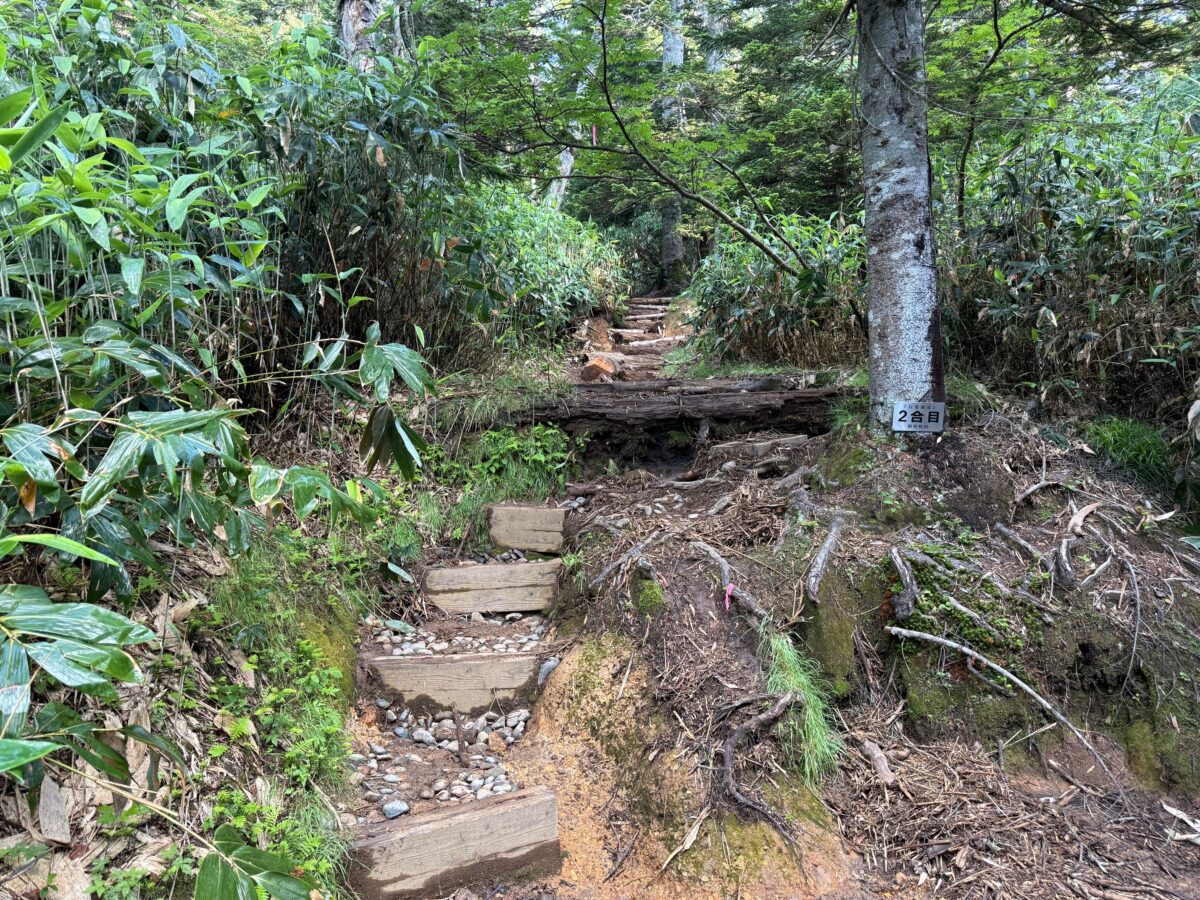 2合目と3合目までは、なだらかな樹林帯の中を歩きます。傾斜が緩やかなので、ぬかるみも多くなります。