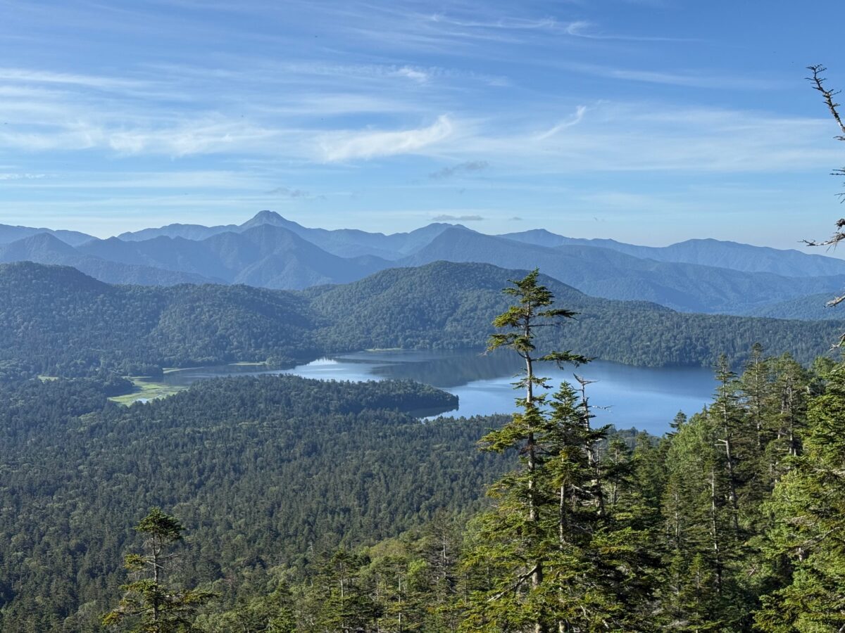 4合目からは樹林が開けた場所に出て、眼下に尾瀬沼が広がります。
