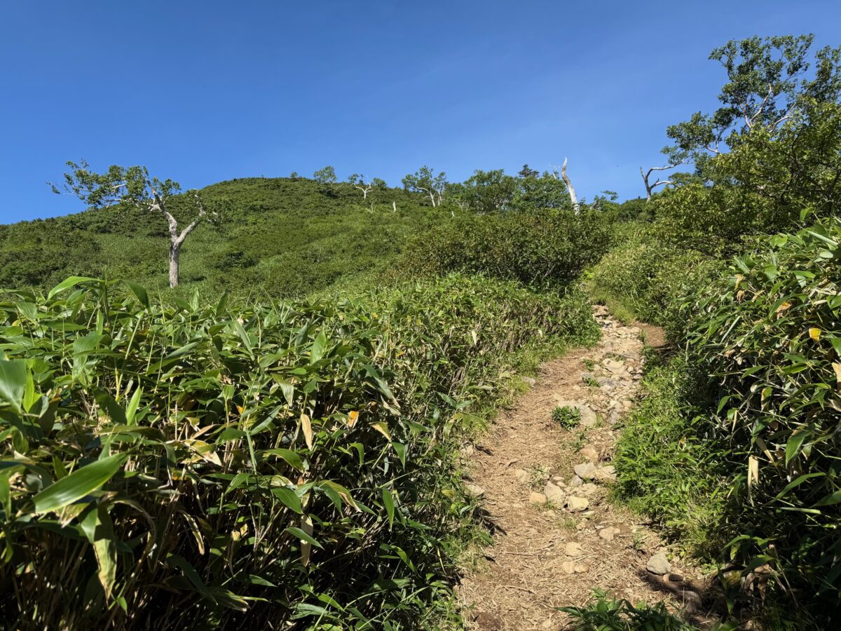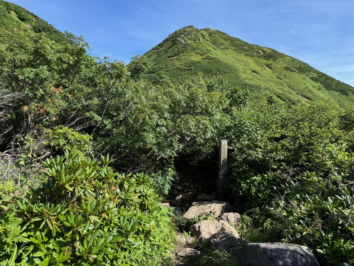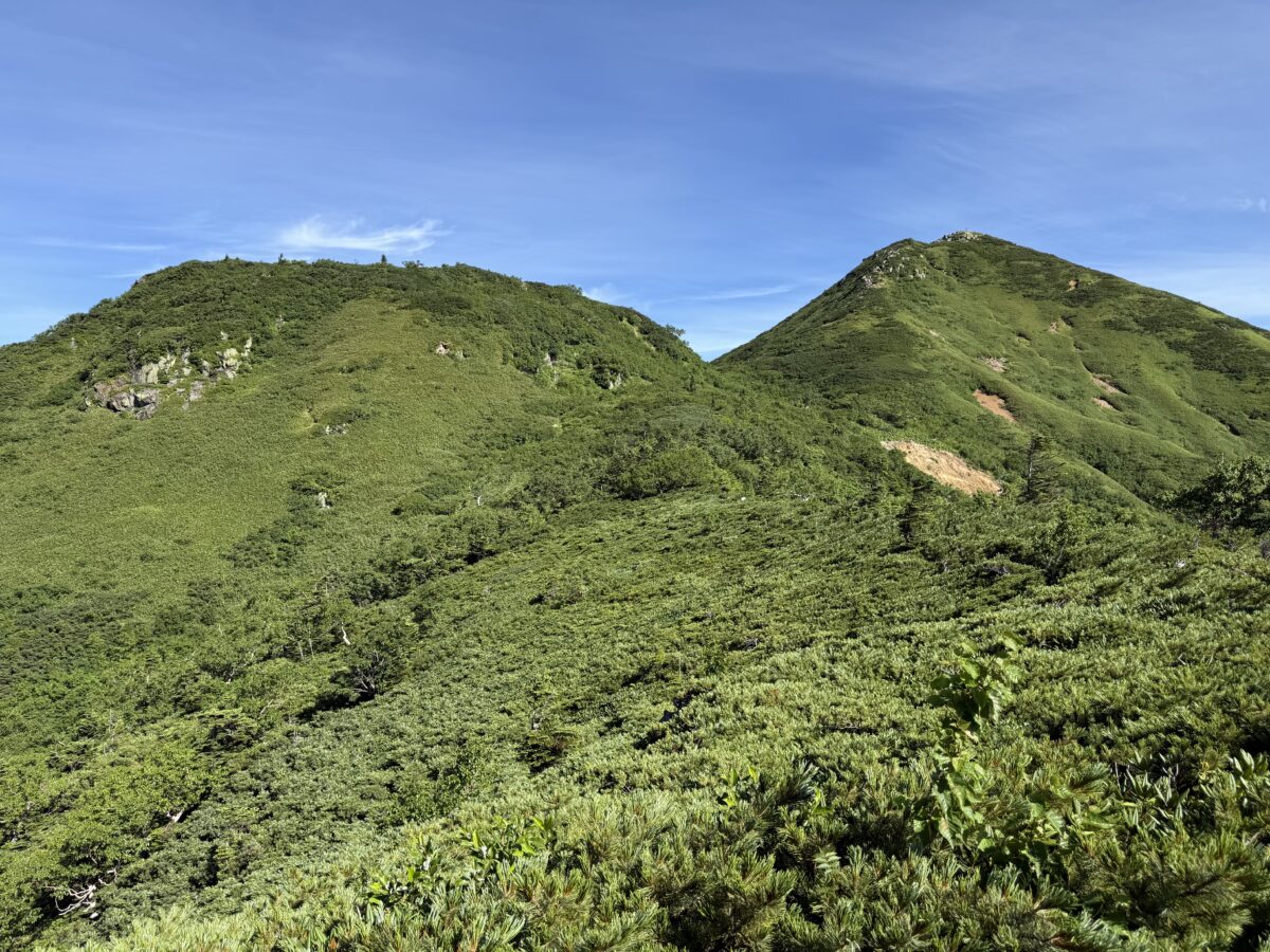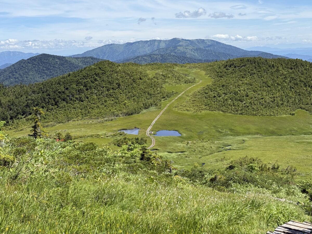 熊沢田代は、広大な傾斜湿原で鞍部に2つの池塘があり休憩を取れるベンチがあります。振り返ると先程までいた俎嵓山頂付近が望めました。