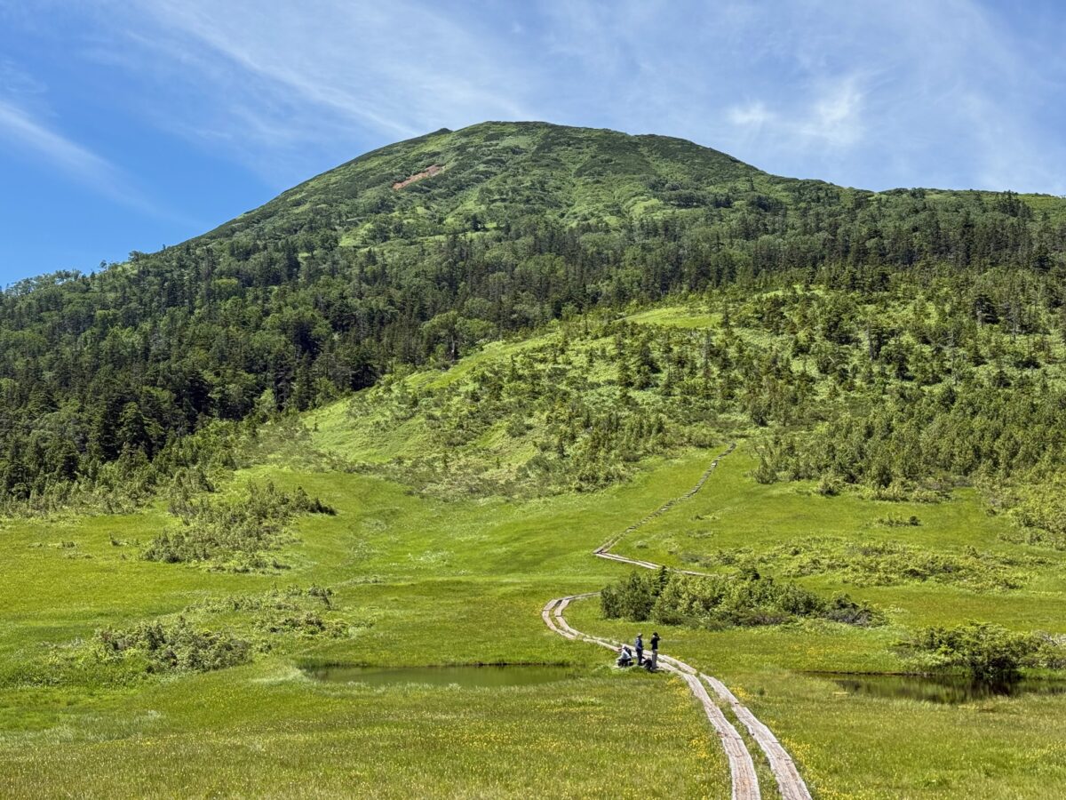 沼尻の木道を歩く人々や、池塘、休憩所や公衆トイレが小さく見えて可愛らしいですね。俎嵓を登る人の姿も見えました。
