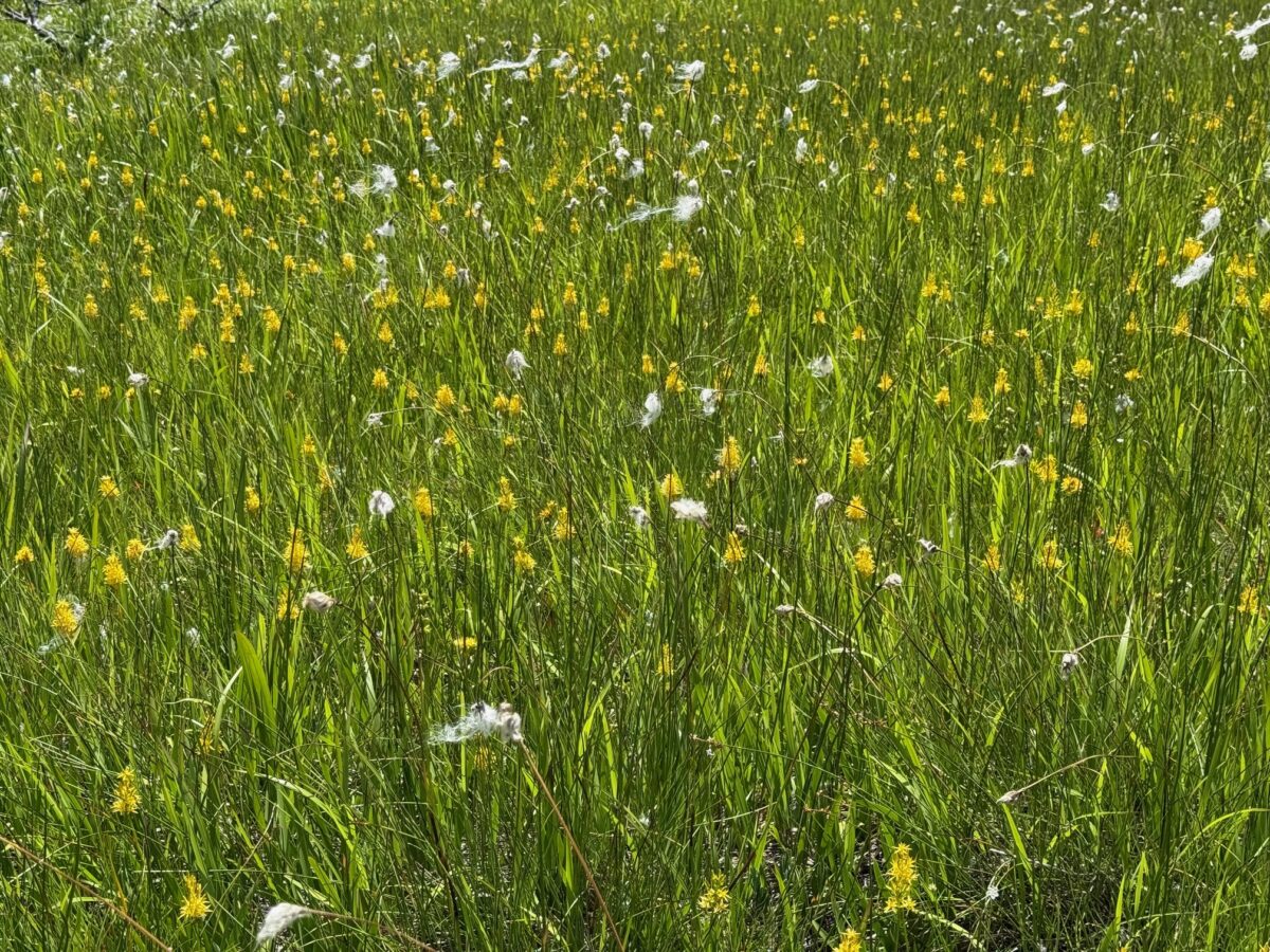 広沢田代は、風に吹かれて飛んで行くワタスゲの白い果穂と、キンコウカの黄色い花に染まっていました。