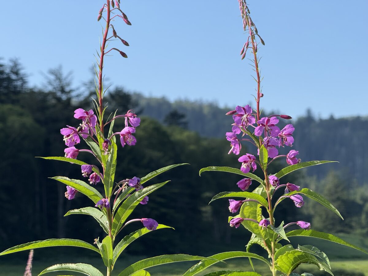 青空がまぶしい大江湿原のヤナギランの丘(平野長蔵の墓と平野家代々の墓所)のヤナギランが咲き始めました。ヤナギランは下から上へ向かって咲いて行きます。