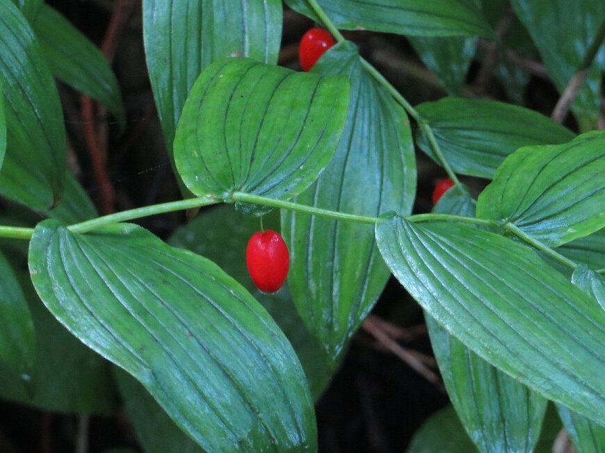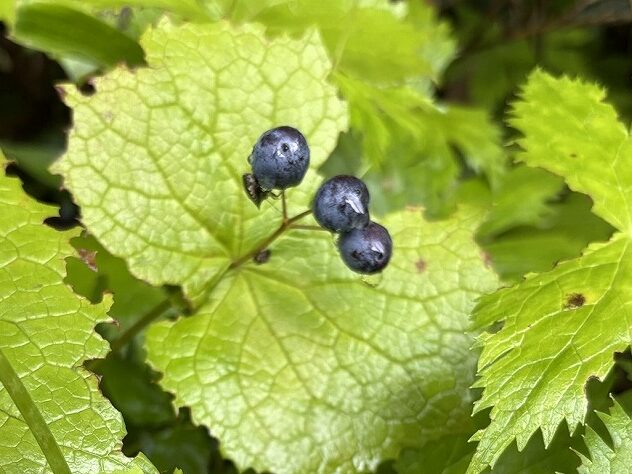 6月中旬に咲いていた白いサンカヨウは、青いブルーベリーのような実になっていました。真っ赤に色づいていたのはオオバタケシマランの実です。葉の付け根にぶらさがるように付いています。
