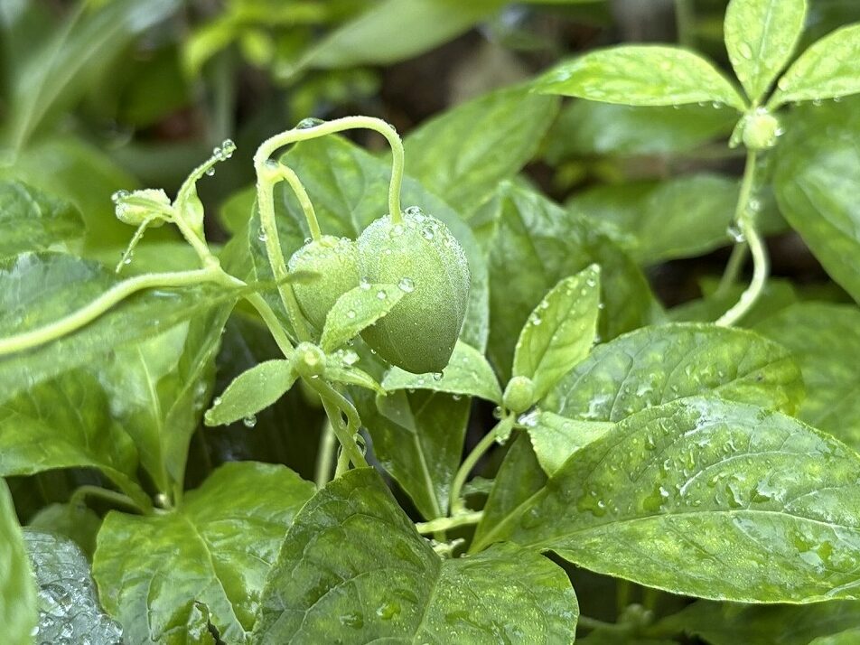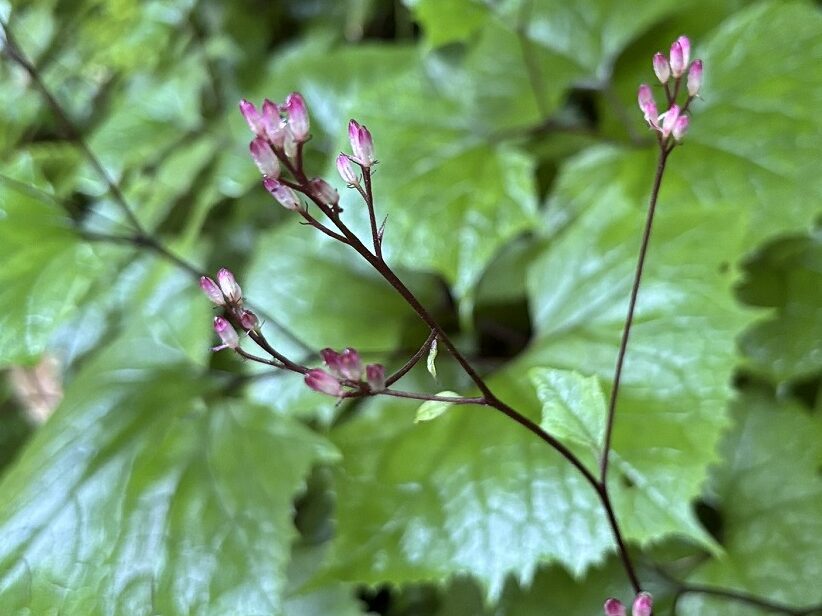 もう少しで咲きそうなのはカニコウモリです。つぼみの先の赤紫色がとても綺麗です。丸く可愛らしいつぼみは、ツルニンジンです。大きなもので2cmくらいになっていました。