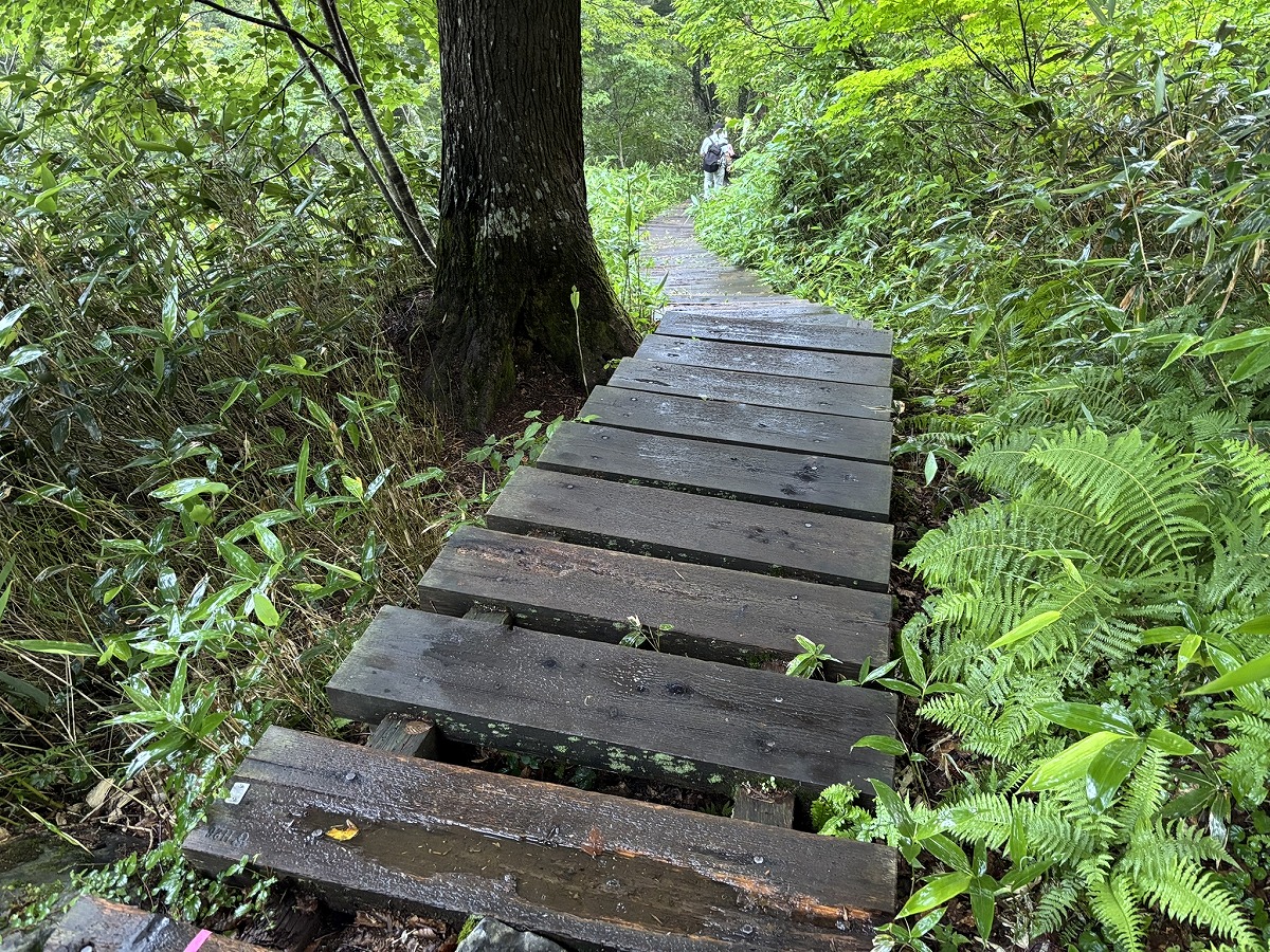 昨夜、雨が降ったので、今朝は木道が濡れていました。雨が降らなくても、早朝の木道は朝露で濡れていることがあります。濡れた木道は滑りやすいので、小さな歩幅でゆっくり歩いてください。