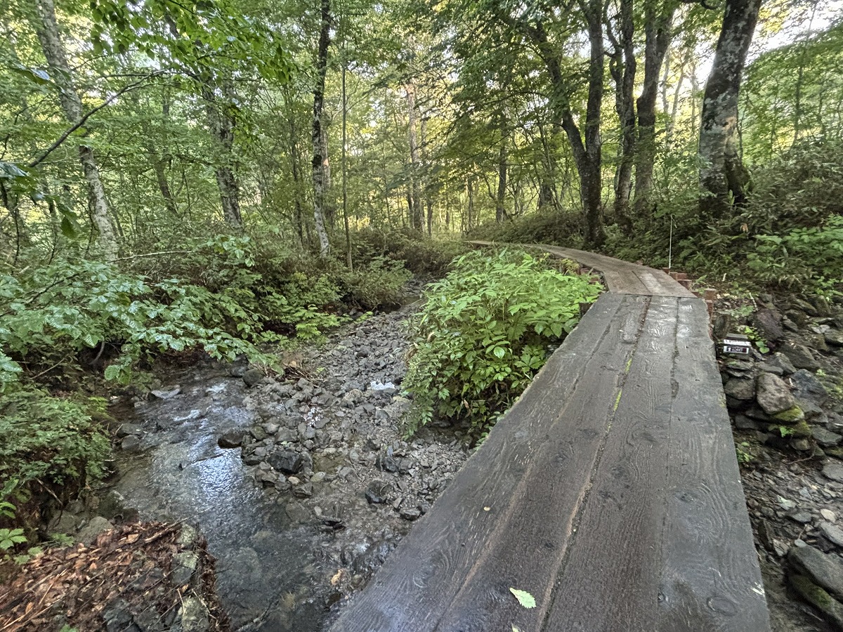 鳩待峠から山ノ鼻へは、距離約3.3km、標高差約200mの下りです。林内を歩く登山道なので涼しいですが、沢付近ではとりわけ清涼感ある空気が流れています。
