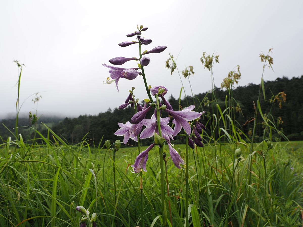 この薄紫色が緑の湿原に映えます。今にも落ちそうな雨のしずくもお花の魅力を引き立たせていました。