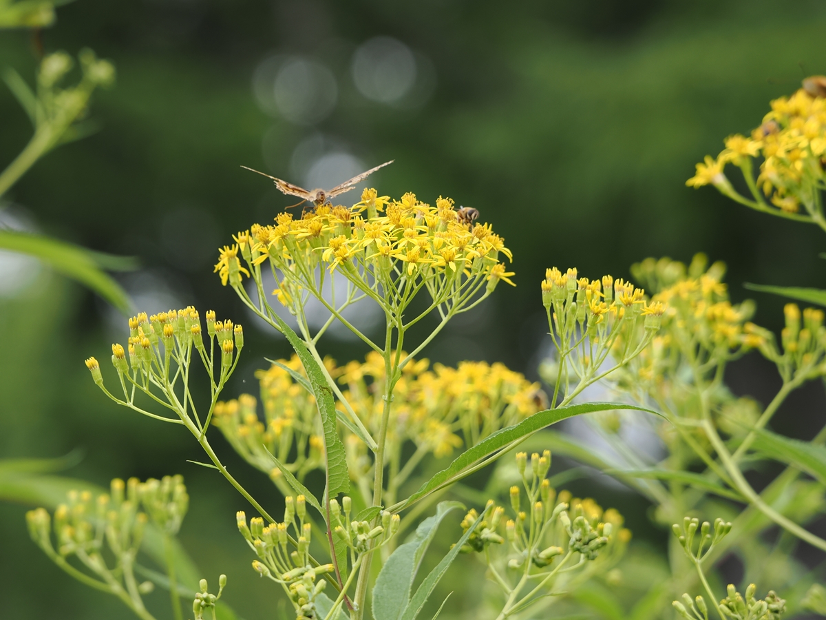 先日駆除作業を行ったオオハンゴンソウは環境省指定特定外来生物ですが、こちらはそうではありません。ビジターセンター前の植え込みでも鮮やかに咲き、多くの虫を集めています。