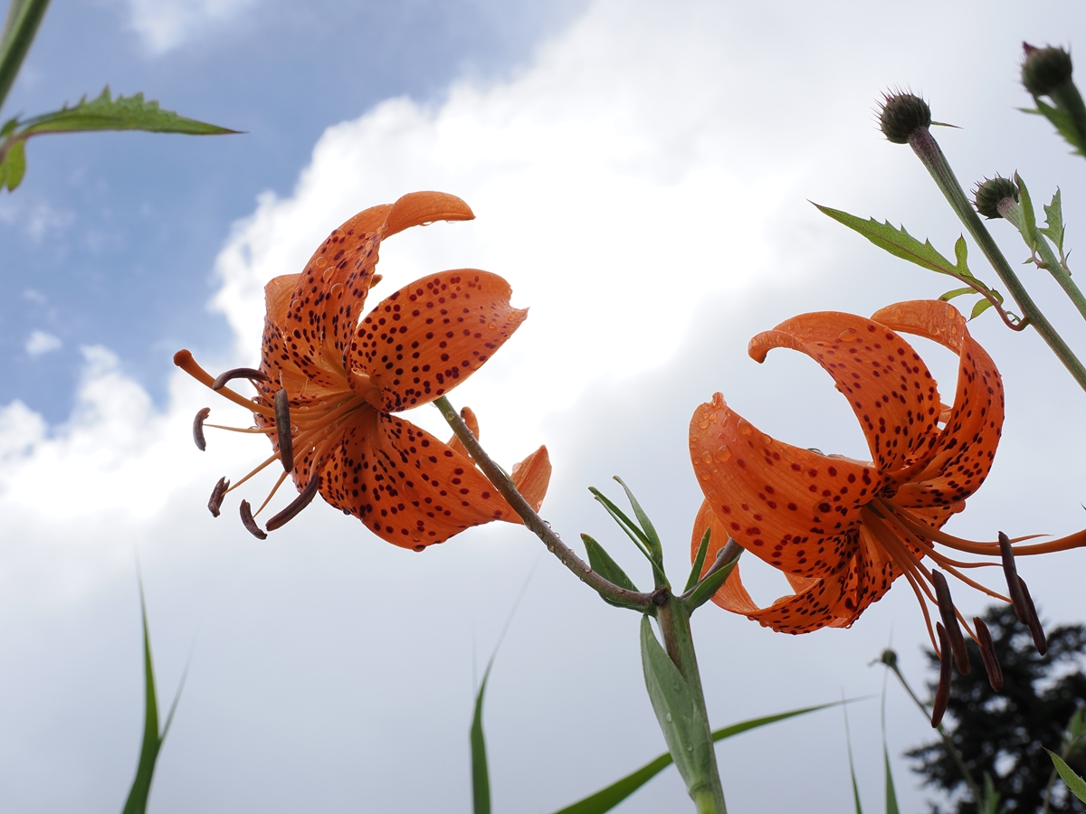 朝は台風9号の影響とみえる強い風と小雨でちょっと心配な天気でしたが、しだいに霧雨から曇り空に変わり、散策しやすい天候となりました。時々見える青空から降り注ぐ太陽光に汗ばむ時もありますが、しっとり濡れた植物がキラキラ輝き、また違った魅力を見せてくれます。