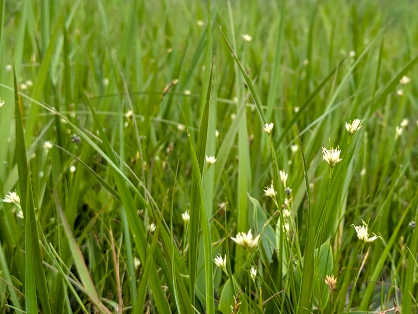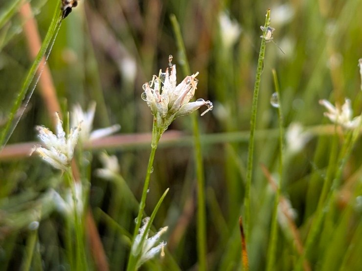 木道を歩いていると、湿原のあちらこちらで白い小さな花が群生しているのに気づきます。ミカヅキグサです。白色の小穂を三日月に見立て名付けられました。緑一面の湿原で、他の色鮮やかな花たちを引き立てる脇役の存在を果してくれています。