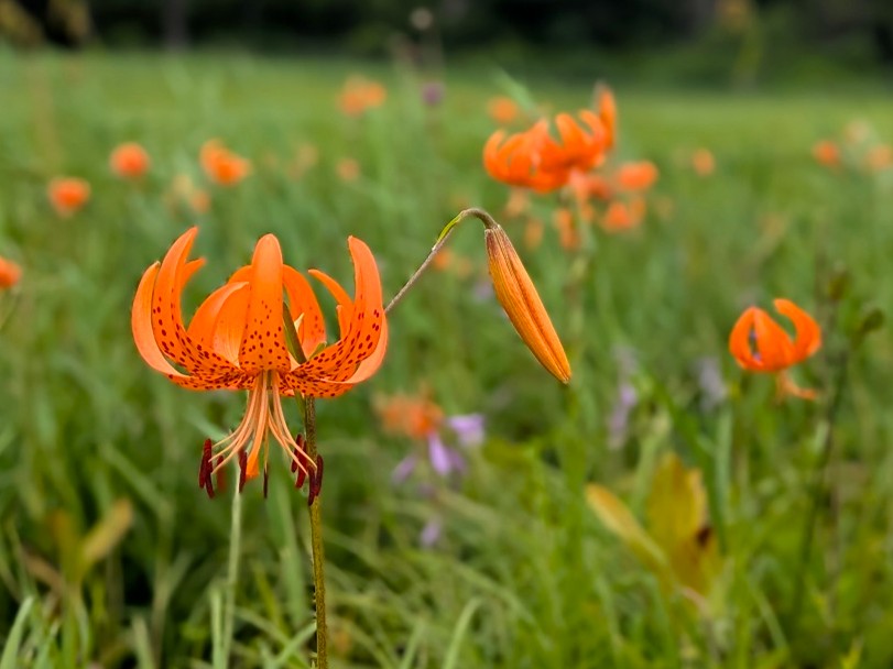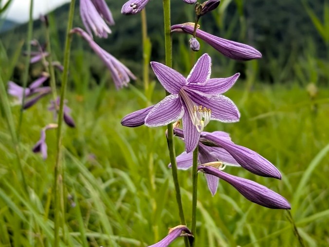 研究見本園の中通りでは、コオニユリ、コバギボウシが群生しています。コオニユリの群生の中ではコバギボウシの紫が映えていました。