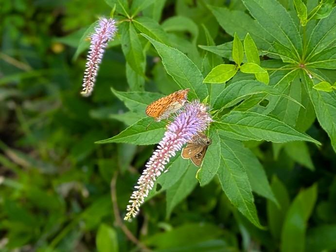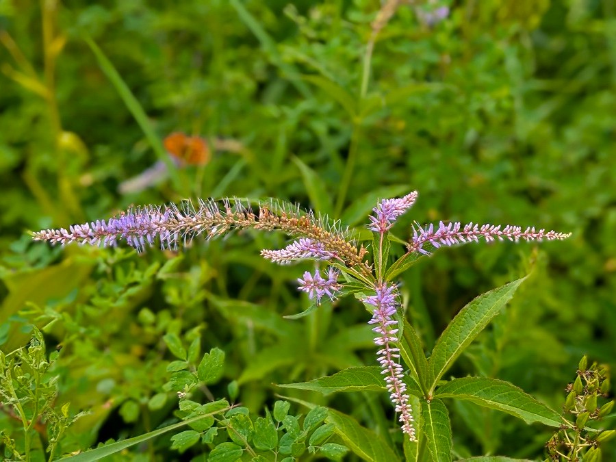 湿原の中で紫色のブラシ状の花を揺らし、目を引いているクガイソウですが、少し変わった花を見つけました。普通は左写真のように茎の先に穂状の花序を一つ付けますが、右写真のような複数の花序を付けたクガイソウがありました。少し豪華に咲き誇っています。