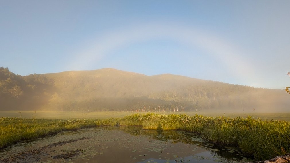 靄の中に日が差し込んでくると、日差しと反対方向に白い虹(白虹)が見えることがあります。今朝は、至仏山を背景に綺麗に見ることができました。