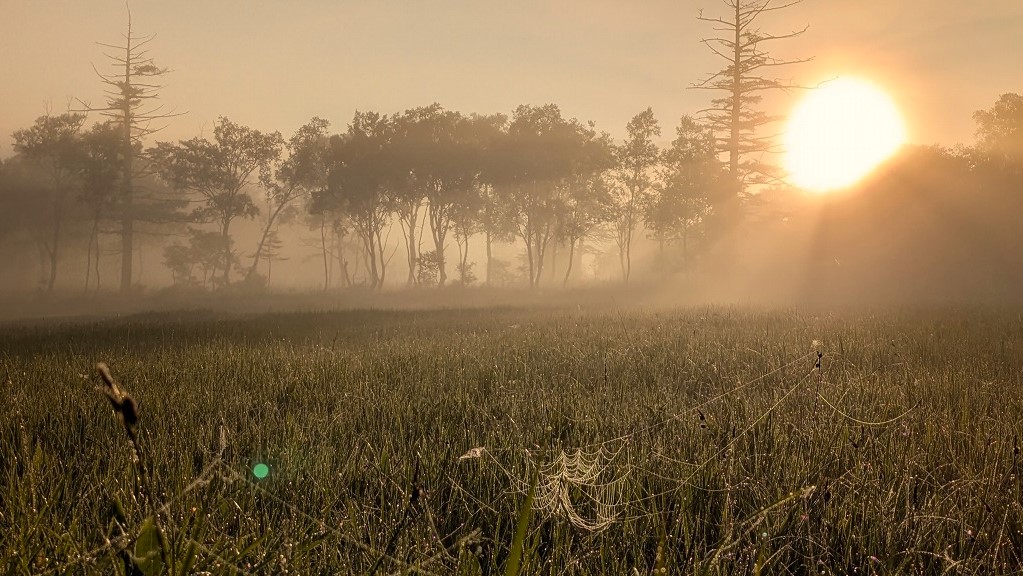 靄が立ち込めた湿原に、朝日が差し込んできました。