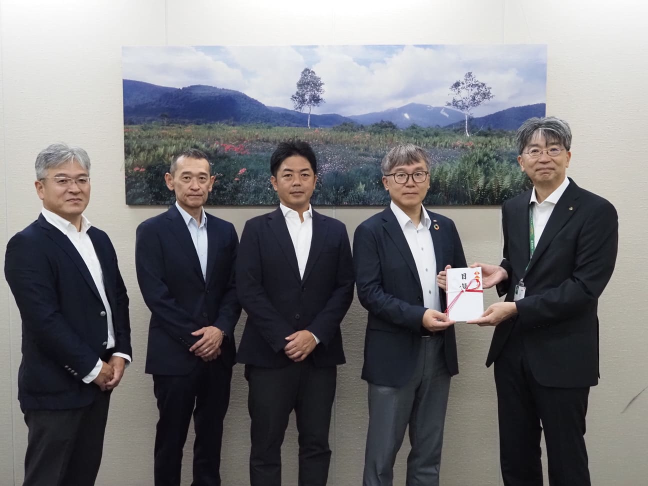 (向かって左から、KDDI株式会社 首都圏総支社 北関東管理部 岩越寿生様、パートナービジネス営業部 見目尚隆様、松澤憲治 北関東支店長様、大可昌明 首都圏総支社長様、公益財団法人尾瀬保護財団 永井浩二 常務理事)